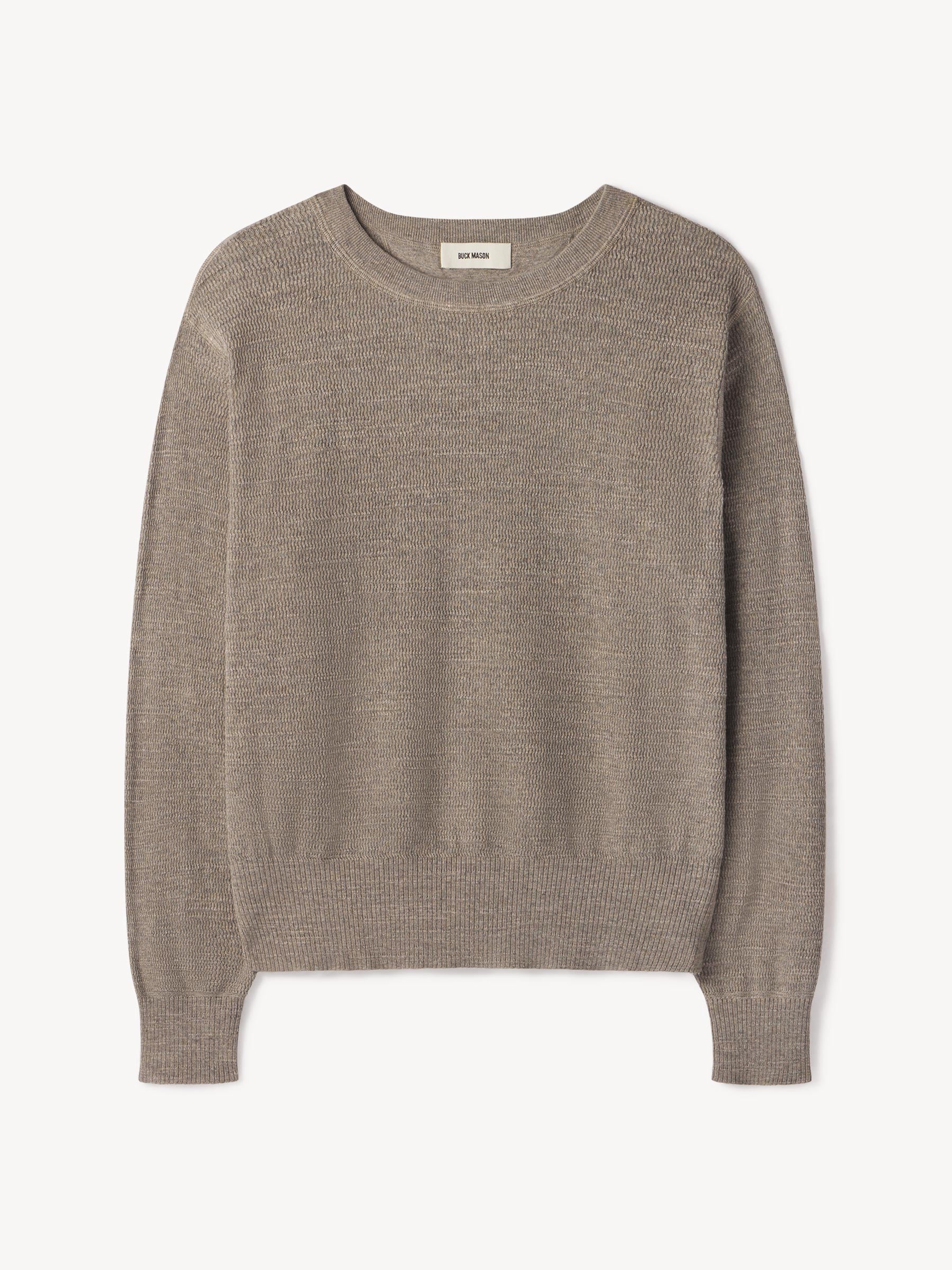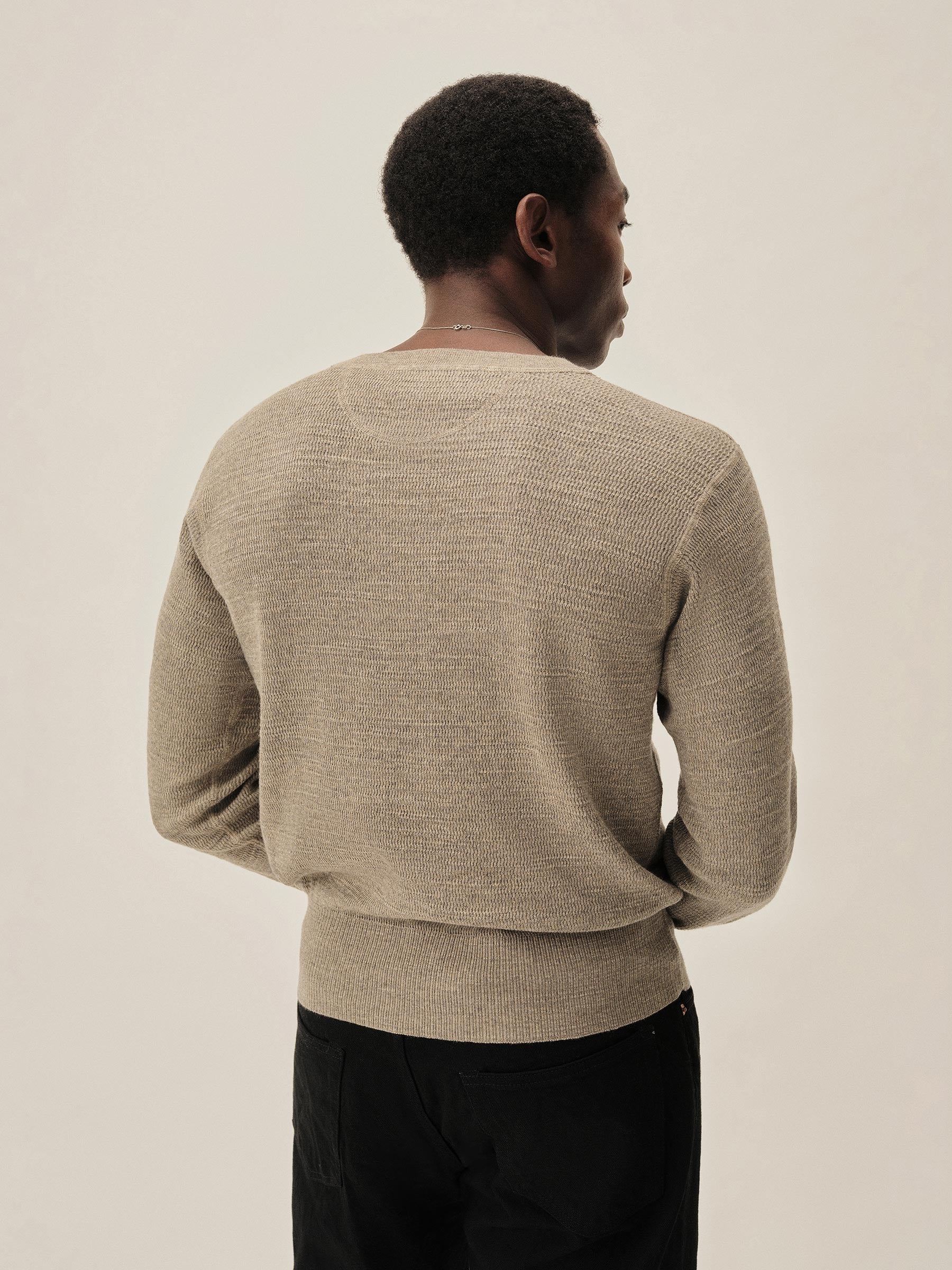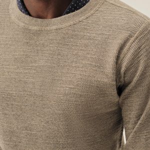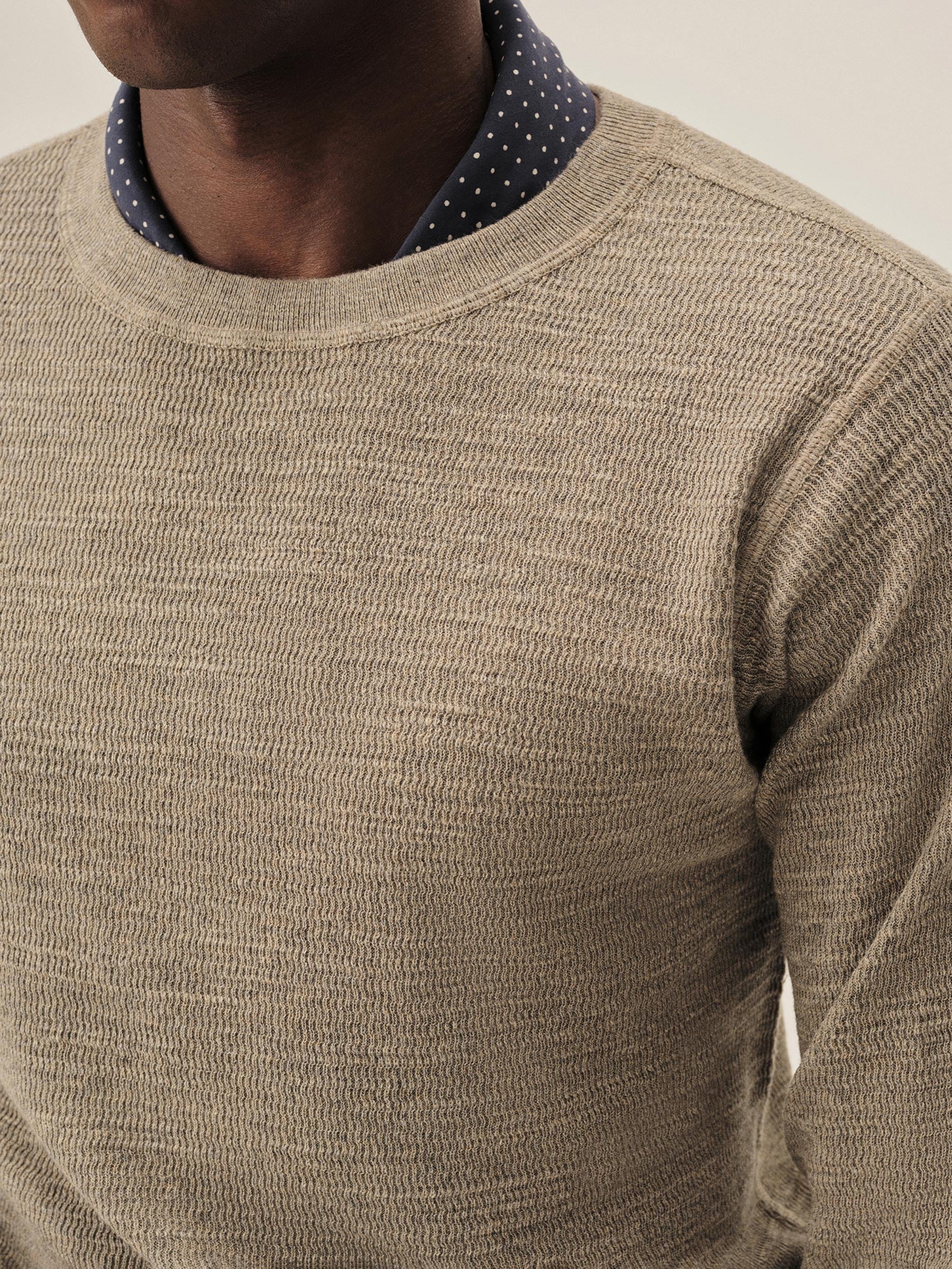 Inspired by WWII-era cut-and-sew thermals, this lightweight crew is knit from 100% slub cotton in a thermal stitch for breathable texture and vintage character. It’s finished with ribbing at the neck, cuffs, and hem, and yarn-dyed and garment-rinsed for a soft hand and broken-in feel.