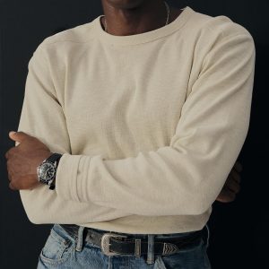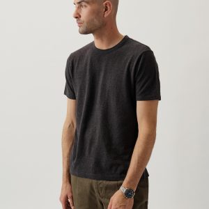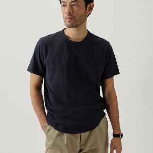 Classic fit short sleeve sweater tee with a straight hem. Yarn-dyed 16 gauge cotton jersey features light slub texture. Features double layer 1×1 ribbing at the collar and rib finishing at the cuffs and hem. Constructed with hand-linked seams for improved durability.