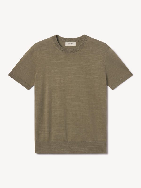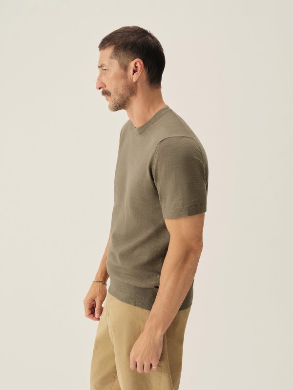 Classic fit short sleeve sweater tee with a straight hem. Yarn-dyed 16 gauge cotton jersey features light slub texture. Features double layer 1×1 ribbing at the collar and rib finishing at the cuffs and hem. Constructed with hand-linked seams for improved durability.