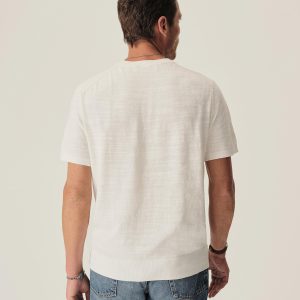 Classic fit short sleeve sweater tee with a straight hem. Yarn-dyed 16 gauge cotton jersey features light slub texture. Features double layer 1×1 ribbing at the collar and rib finishing at the cuffs and hem. Constructed with hand-linked seams for improved durability.