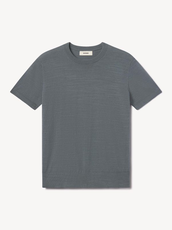 Classic fit short sleeve sweater tee with a straight hem. Yarn-dyed 16 gauge cotton jersey features light slub texture. Features double layer 1×1 ribbing at the collar and rib finishing at the cuffs and hem. Constructed with hand-linked seams for improved durability.