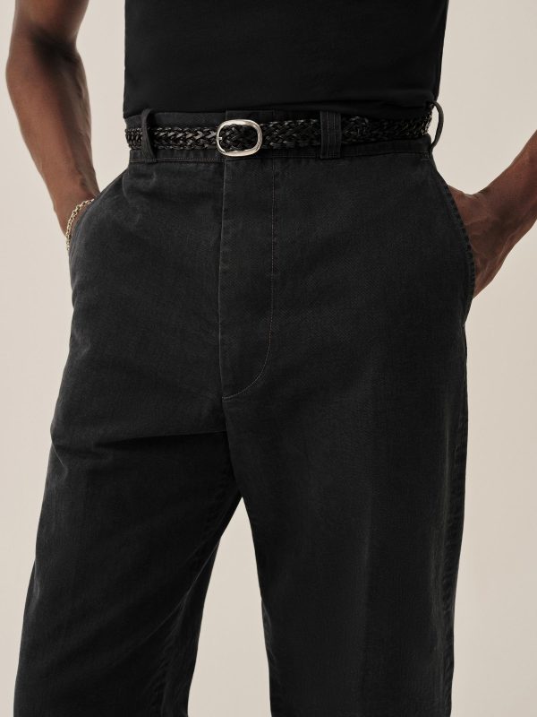 Inspired by 1960s military-issued chinos, an authentic period silhouette with a high rise, full top block, and a full leg. Cut from sulfur-dyed Japanese twill and constructed with busted seaming at the back rise, inseams, and outseams, along with tunnel belt loops and single-welt back pockets. Finished with corozo buttons, a Talon 42 zip, and a zip fly Stonewashed for a lived-in look and feel.