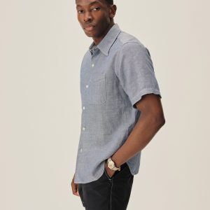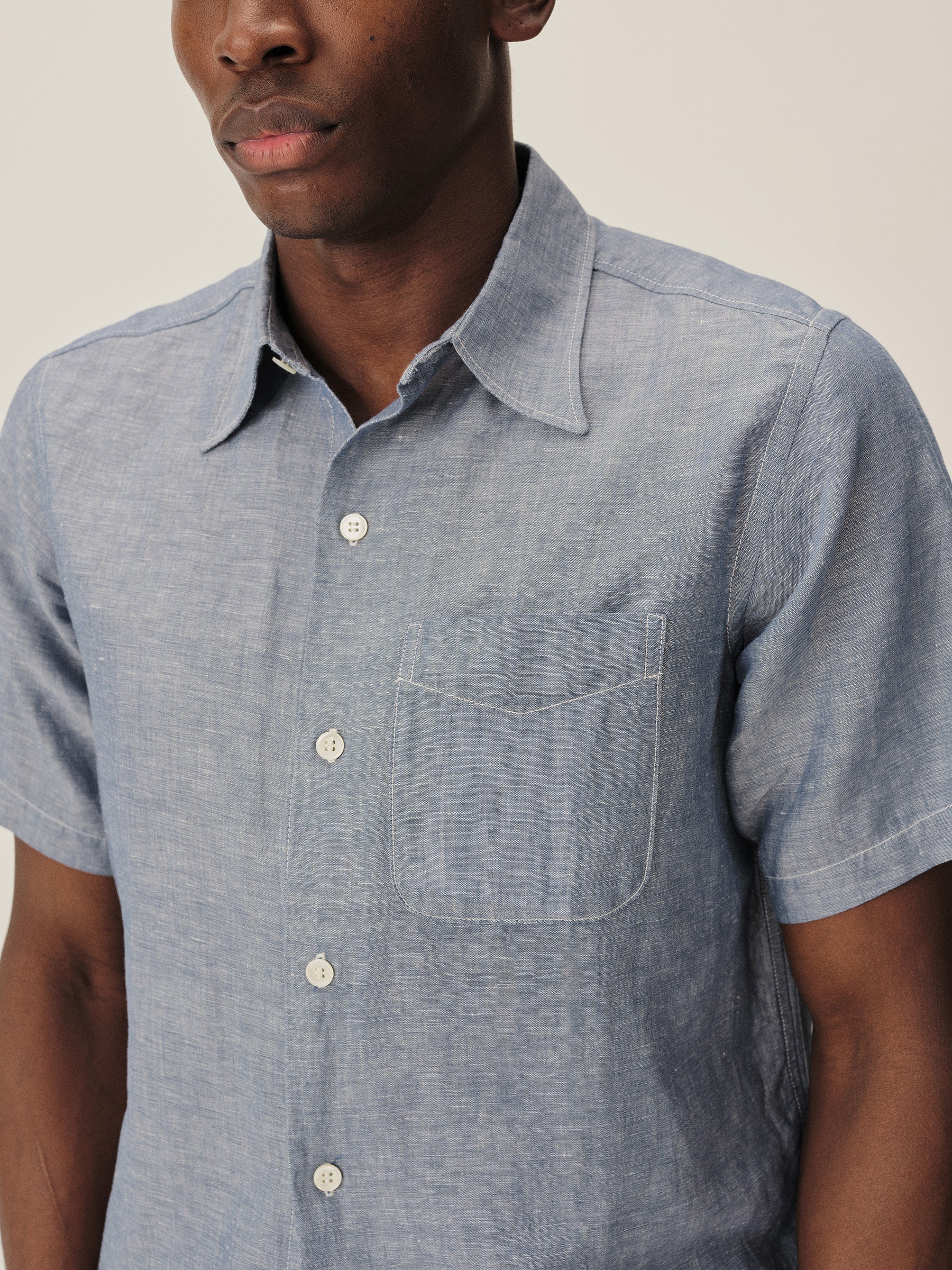 The quintessential short sleeve button-up in a classic fit inspired by a 1940s uniform shirt from our archives. Cut from a lightweight cotton linen blend with a breathable open weave. Details include a perfectly-proportioned point collar, a single chest pocket, and a curved hem.