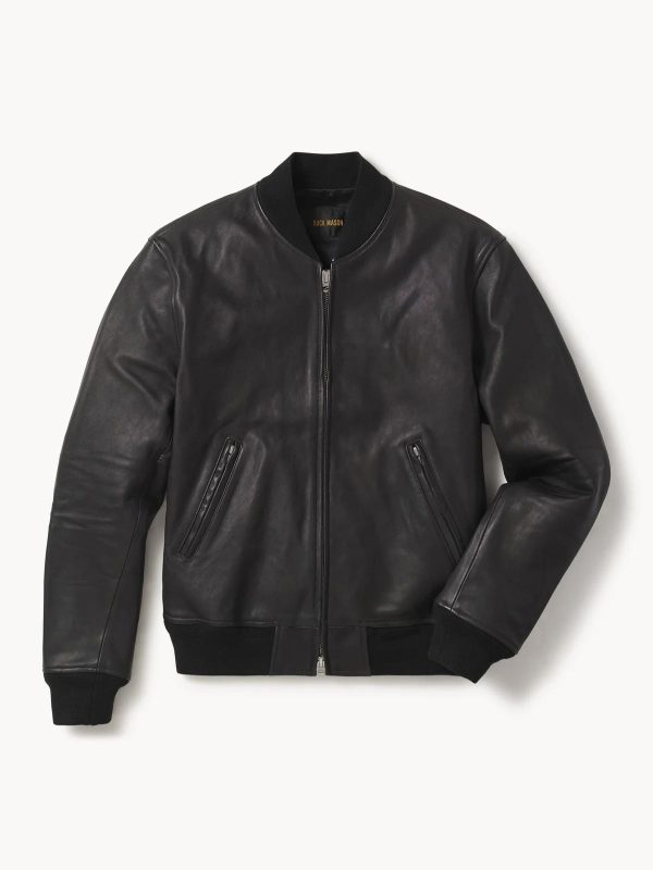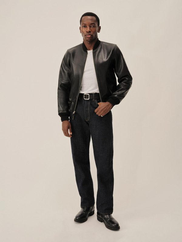Vintage fit hand-cut bomber jacket in semi-vegetable tanned sheepskin. Two-stage dye process: first, the leather crust is dyed, then a second top dye is applied for a more natural patina. Details include angled zip pockets at the hips and cotton/wool ribbed cuffs and waistband with racking stitch detail. Features Bemberg™ lining. Garment washed, waxed, and hand-burnished for a lived-in feel.