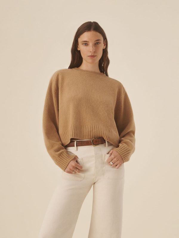 A cozy crewneck crafted from 100% cashmere in a soft jersey stitch. Designed with a boxy, oversized silhouette and saddle-shaped armholes, and finished with ribbed trims at the neckline, cuffs, and hem.