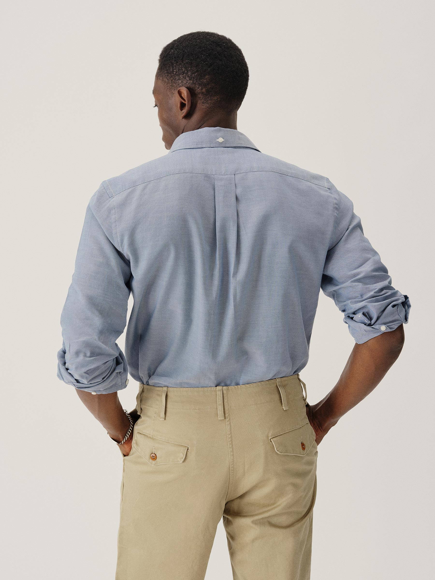 Classic fit button down collar shirt cut from a proprietary 3 oz blend of cotton and tencel. Details include mother of pearl buttons, a single scallop pocket, and a box pleat at the back. Constructed with clean finished seams. Garment washed for a lived-in look and feel.