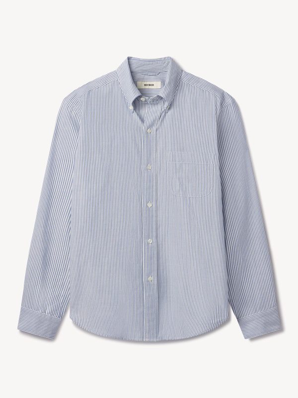 Classic fit button down collar shirt cut from a proprietary 3 oz blend of cotton and tencel. Details include mother of pearl buttons, a single scallop pocket, and a box pleat at the back. Constructed with clean finished seams. Garment washed for a lived-in look and feel.