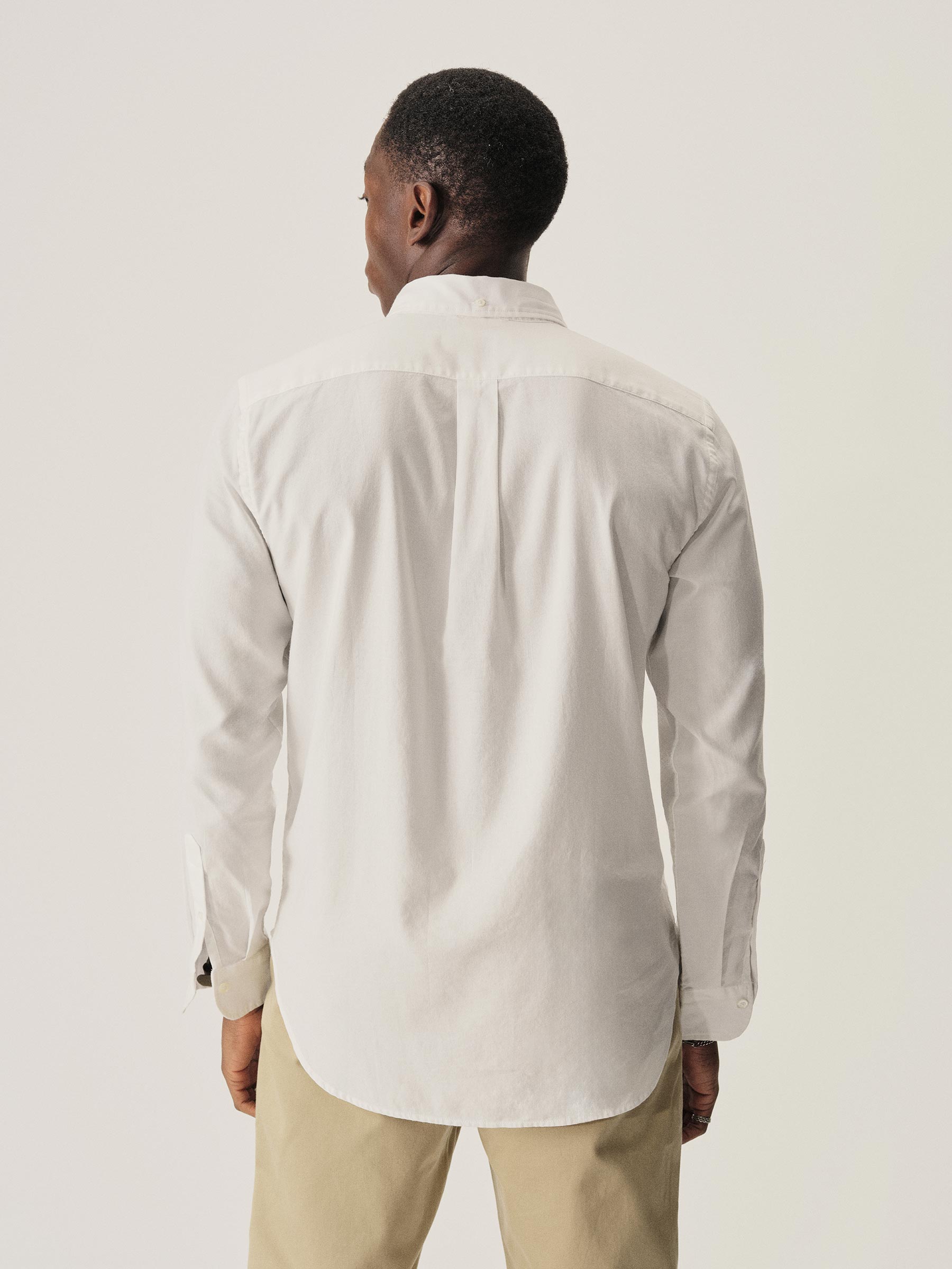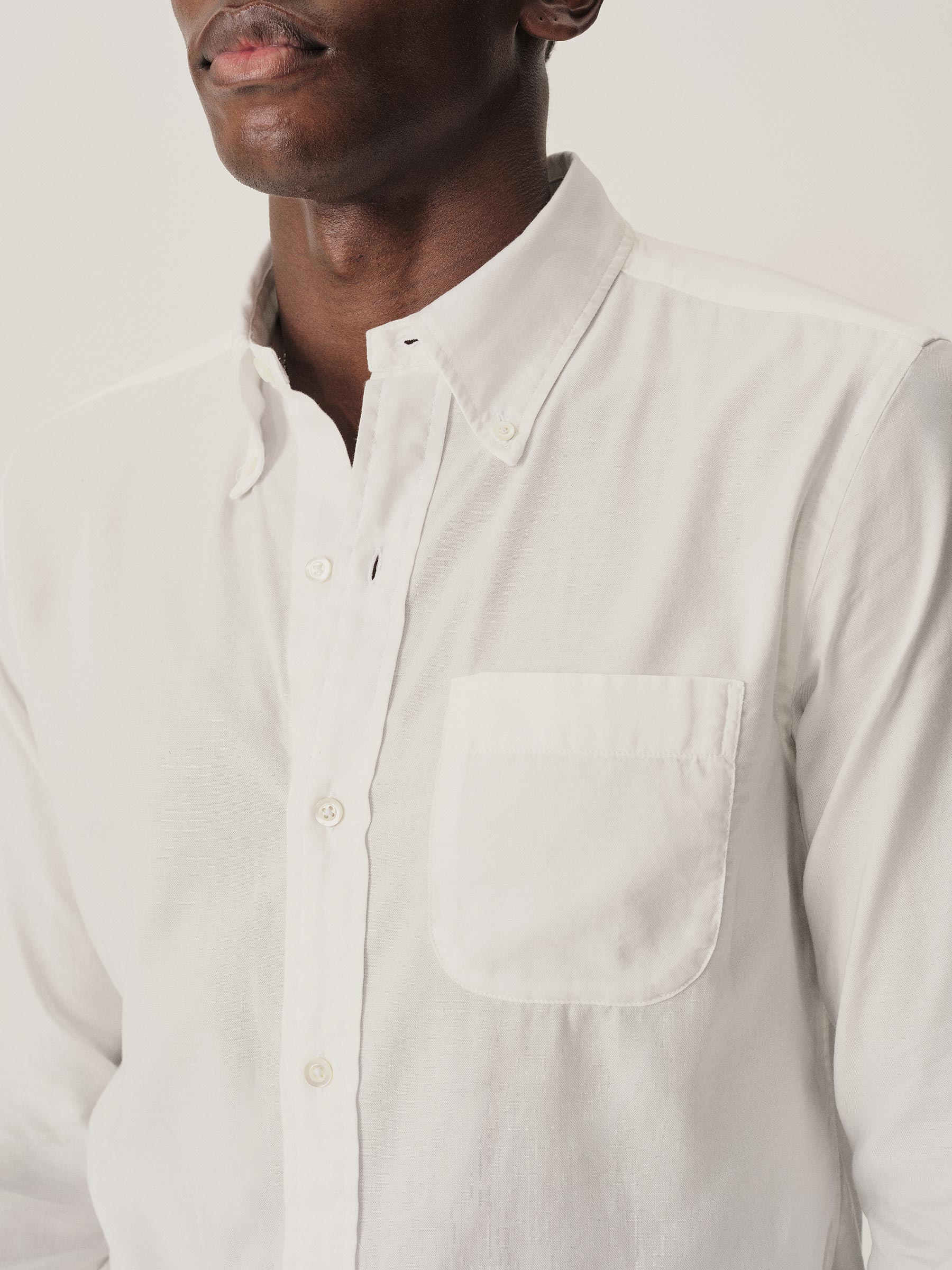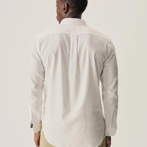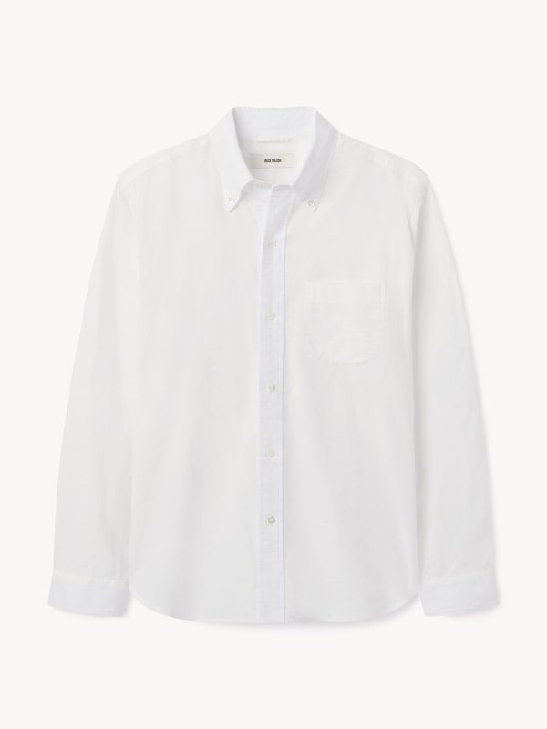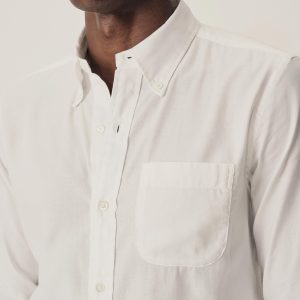 Classic fit button down collar shirt cut from a proprietary 3 oz blend of cotton and tencel. Details include mother of pearl buttons, a single scallop pocket, and a box pleat at the back. Constructed with clean finished seams. Garment washed for a lived-in look and feel.