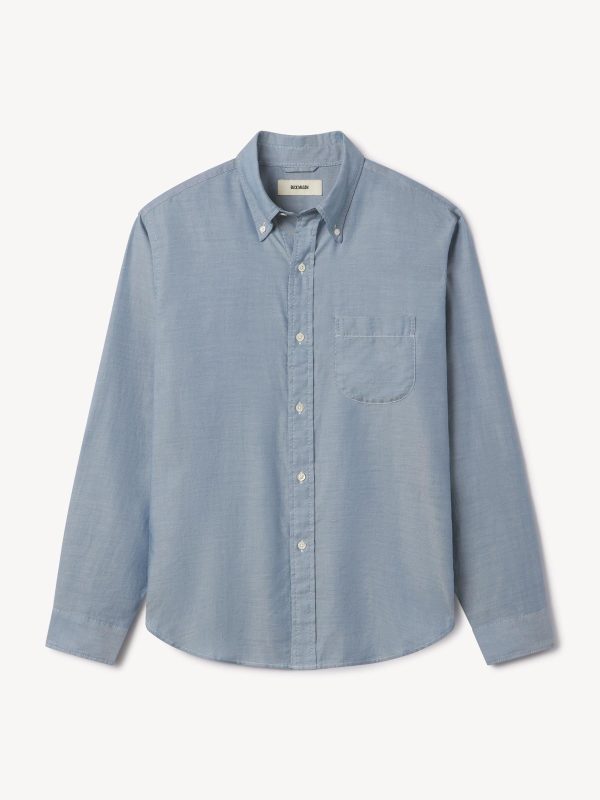Classic fit button down collar shirt cut from a proprietary 3 oz blend of cotton and tencel. Details include mother of pearl buttons, a single scallop pocket, and a box pleat at the back. Constructed with clean finished seams. Garment washed for a lived-in look and feel.