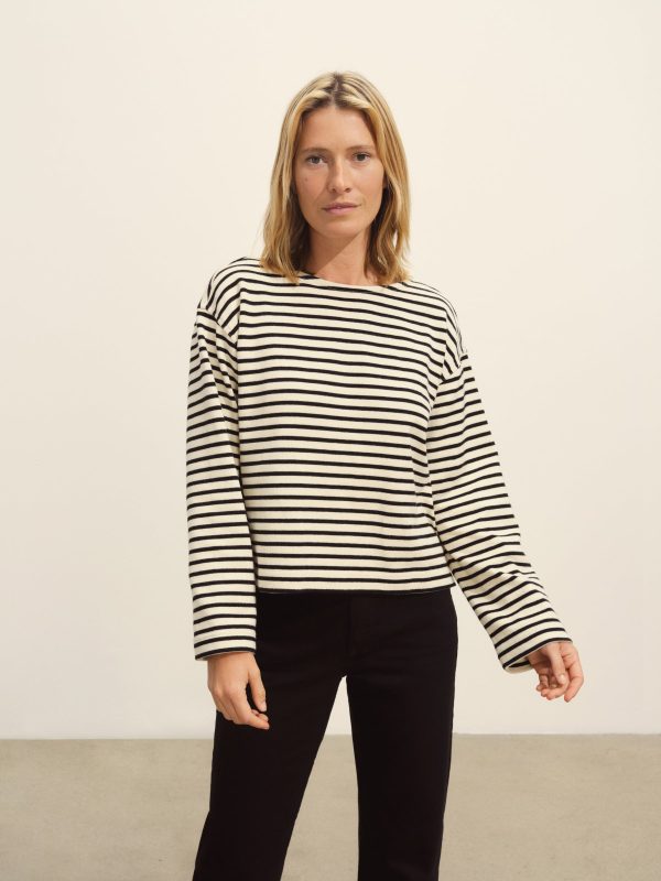 Relaxed long sleeve boatneck tee inspired by the classic French breton shirts. Cut from sturdy, compact 350 GSM cotton. Details include a taped boatneck neckline and side slits at the hem. Constructed with flatlock stitching throughout and double needle coverstitching at the hem. Garment washed for a lived-in feel.
