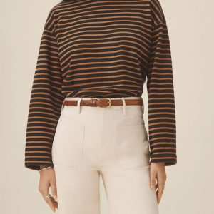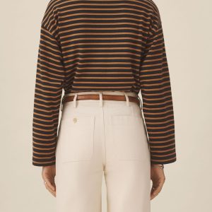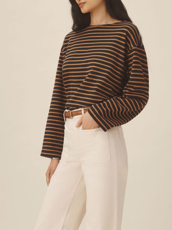 Relaxed long sleeve boatneck tee inspired by the classic French breton shirts. Cut from sturdy, compact 350 GSM cotton. Details include a taped boatneck neckline and side slits at the hem. Constructed with flatlock stitching throughout and double needle coverstitching at the hem. Garment washed for a lived-in feel.