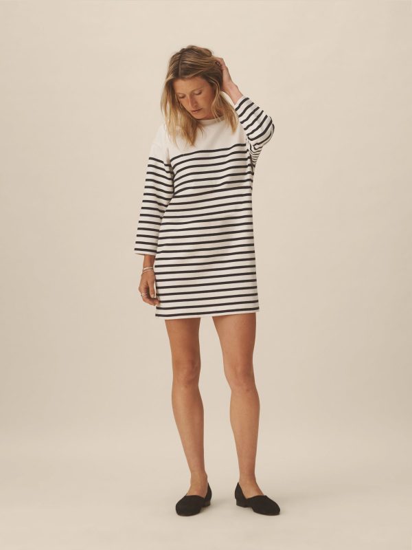 Inspired by classic French Breton stripe shirts, a relaxed boatneck shift dress with long sleeves, made from heavy cotton jersey. Detailed with herringbone tape along the side slits and neckline and finished with a garment wash for a soft, broken-in feel.