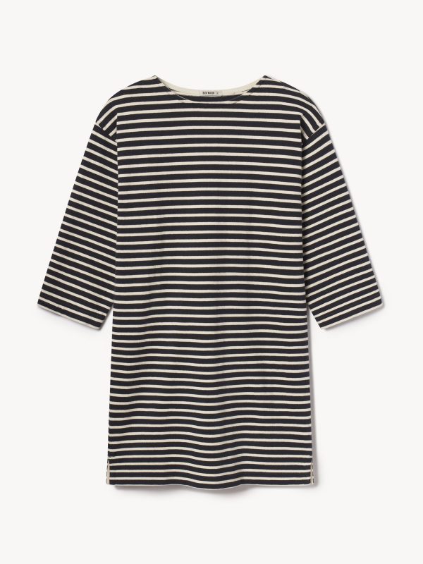 Inspired by classic French Breton stripe shirts, a relaxed boatneck shift dress with long sleeves, made from heavy cotton jersey. Detailed with herringbone tape along the side slits and neckline and finished with a garment wash for a soft, broken-in feel.