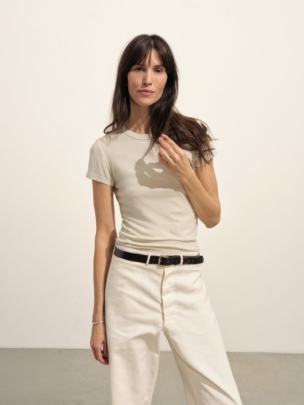 Slim fit crewneck tee cut from a supersoft 130 GSM blend of bamboo, cotton, and wool. Features a straight hem, a self bound neck, and raised armholes that hug the contours of the shoulders. Garment washed for a lived-in feel.
