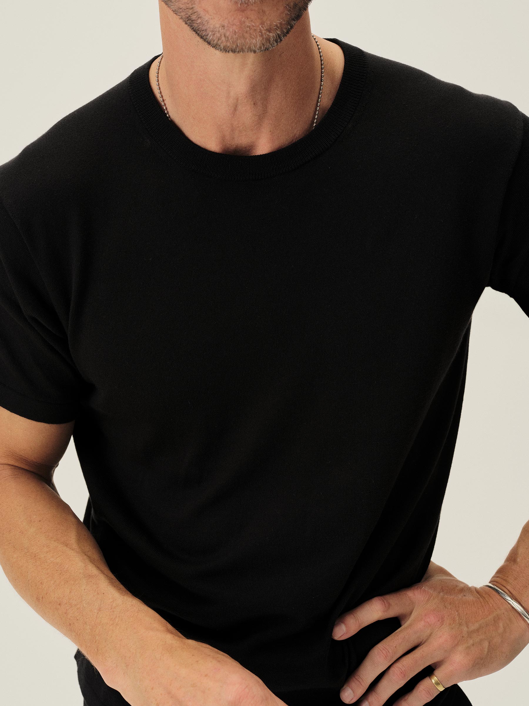 A fully fashioned tee that draws inspiration from the lifestyle surrounding Lake Como in the 1960s. Knit from an ultrafine blend of yarn-dyed organic Egyptian cotton and cashmere, spun in Italy. Featuring tubular finishes at the cuffs and bottom hem, and a shallow sleeve cap.