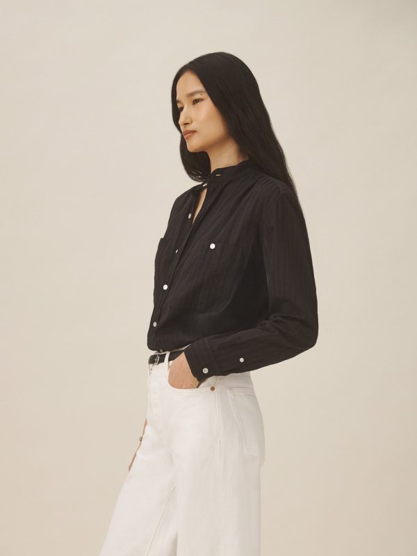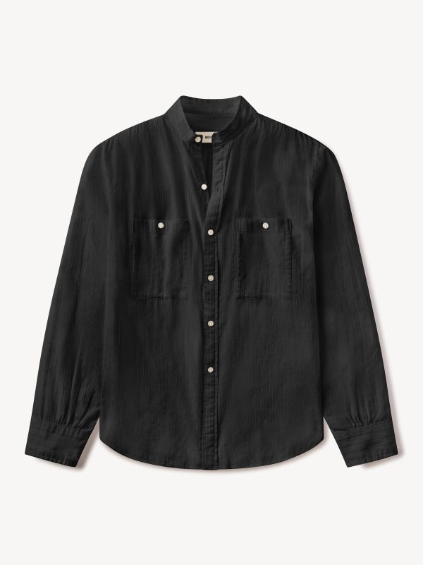Relaxed-fit sheer shirt made from breathable 80-GSM cotton for a comfortable and airy feel. Featuring shirring at the shoulders and cuffs, a back yoke, and two chest pockets with button closures. Finished with mother of pearl buttons, button-through cuffs, and felled seams. Garment washed for a soft, worn-in feel.