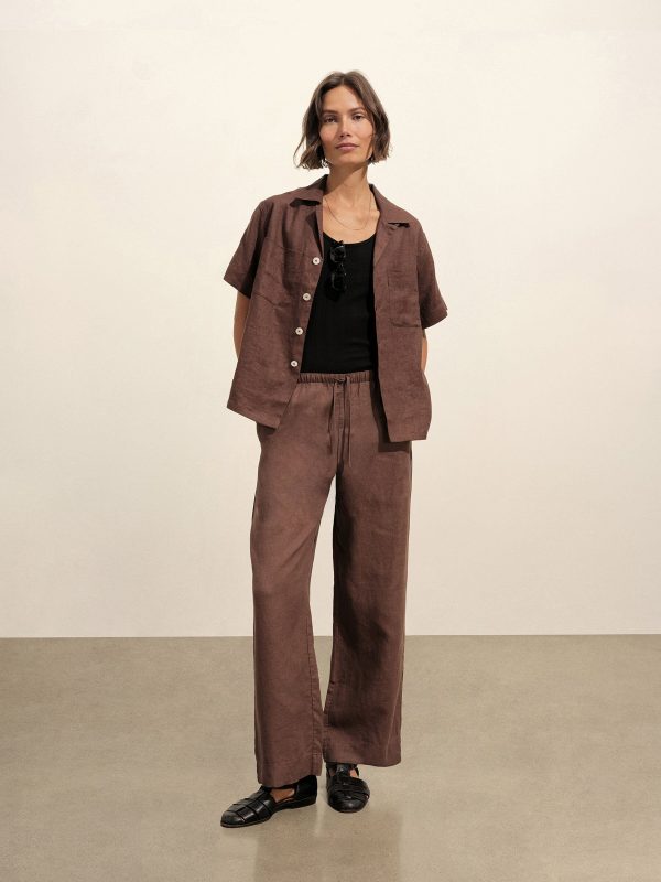 Easy wide-leg pull-on pant with a 29” inseam and an elasticated waistband that can be worn at the high-waist or low on the hip. Cut from 4.8 oz. linen plainweave. Features a cotton drawcord for fit adjustments, front slash pockets, and patch pockets at the back. Garment washed with softener for a lived-in feel.