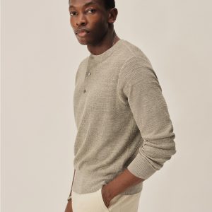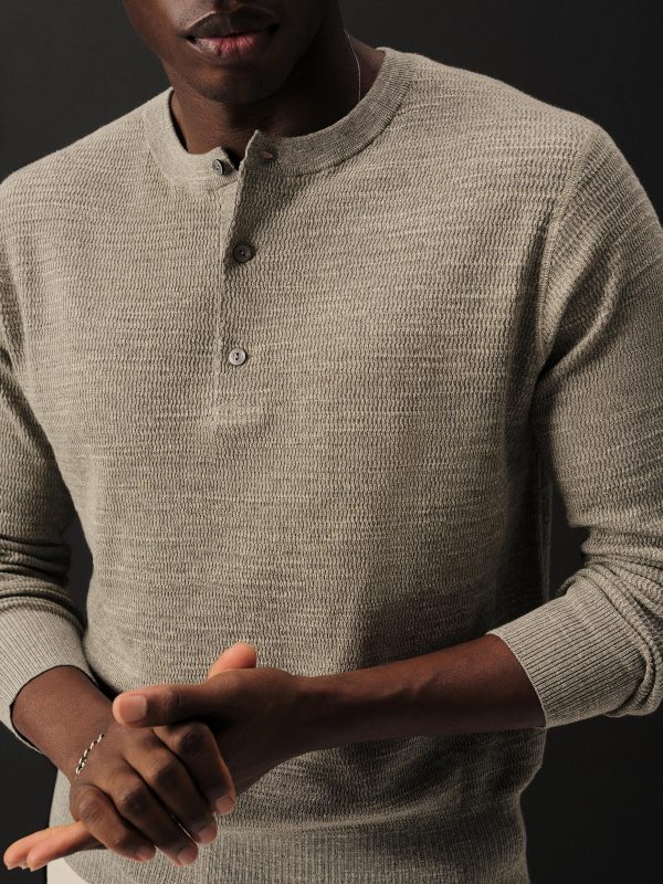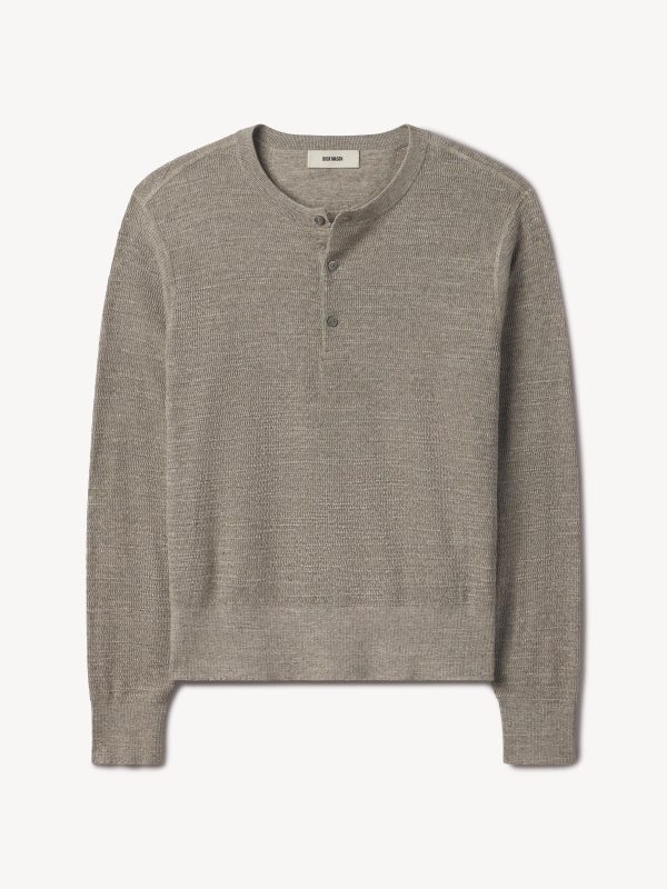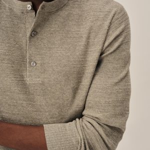 A standard fit, vintage-inspired thermal stitch henley crafted from slubby, yarn-dyed cotton. Featuring variegated rib finishes at the cuffs and bottom hem, and coverstitching along the seams. Finished with a three button shell closure.