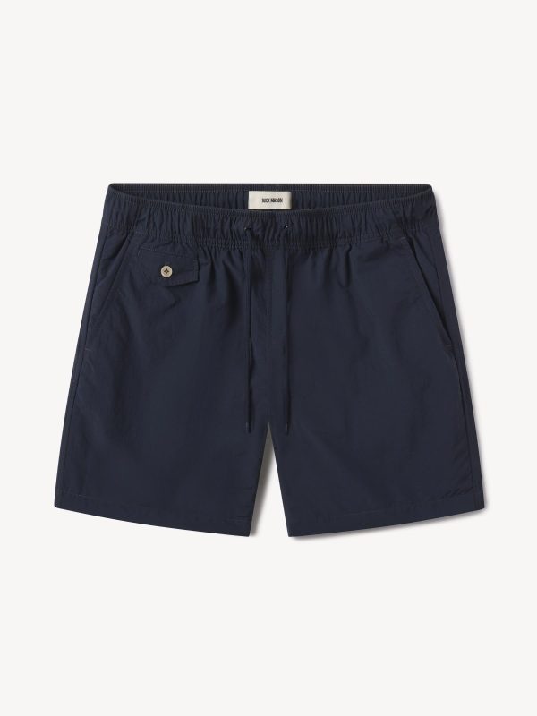 Classic swim shorts are made from lightweight woven nylon using recycled plastic waste found in the ocean. They feature an elastic waistband with an added drawstring for the perfect fit. A small front buttoned pocket and button flapped back pocket help you stow your necessaries in addition to two front slash pockets. 5.5-inch inseam.