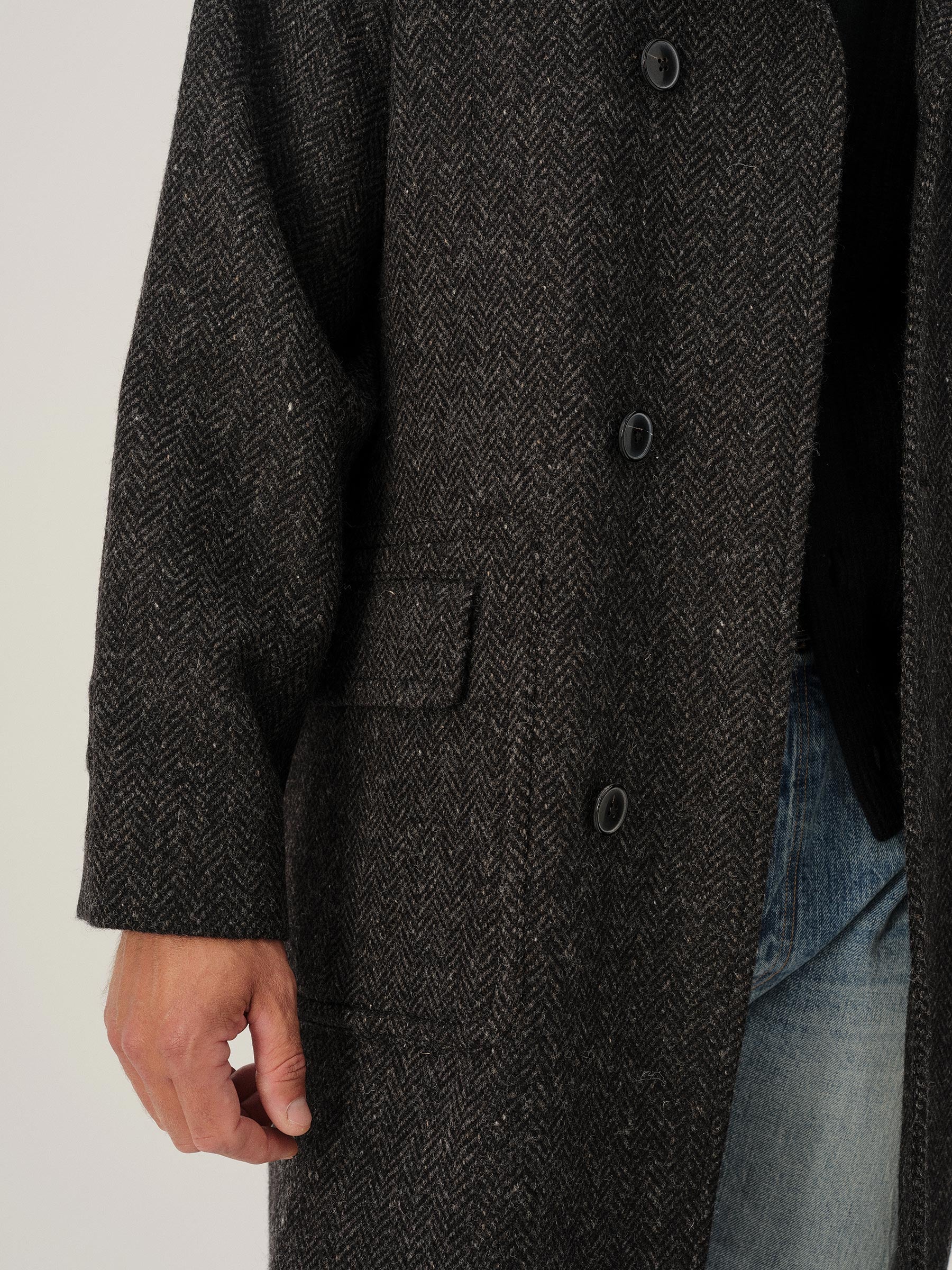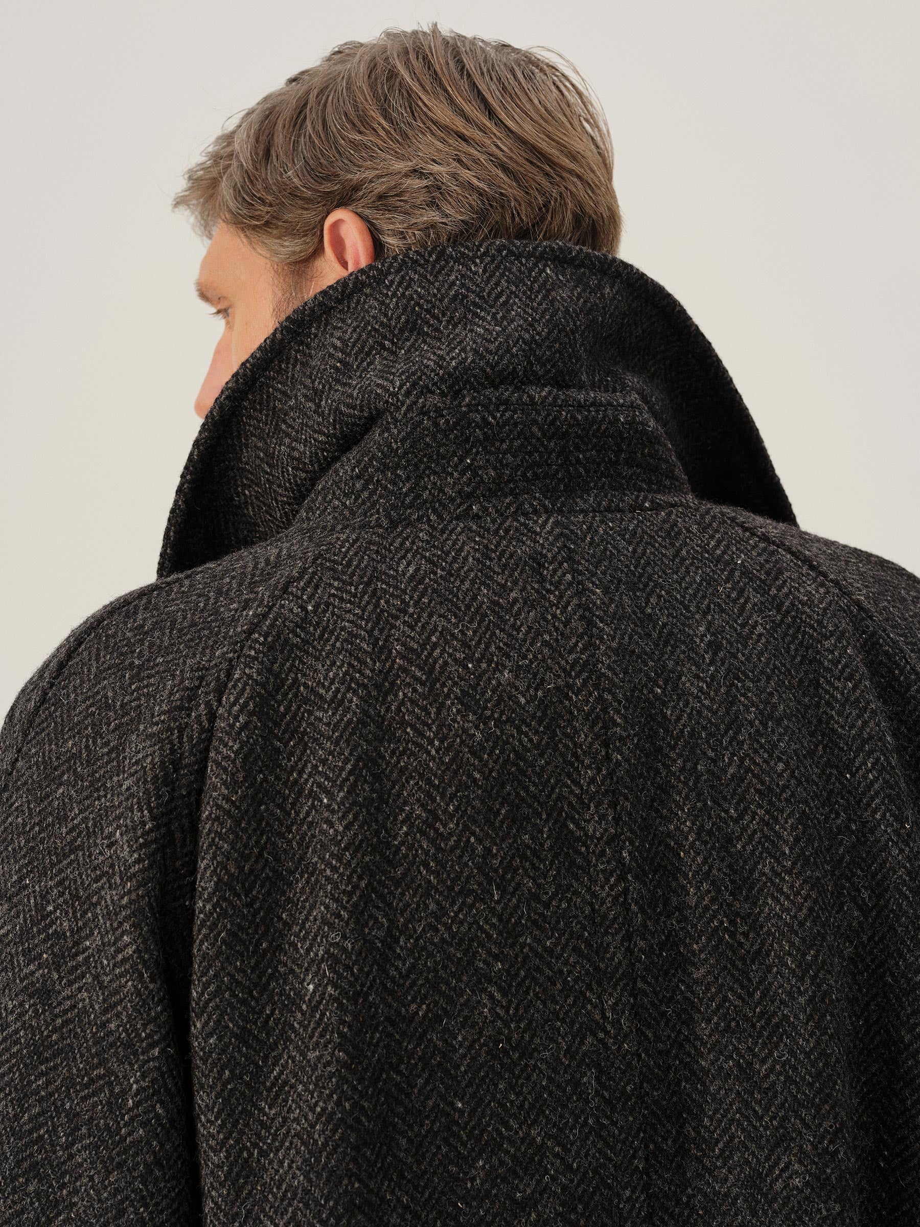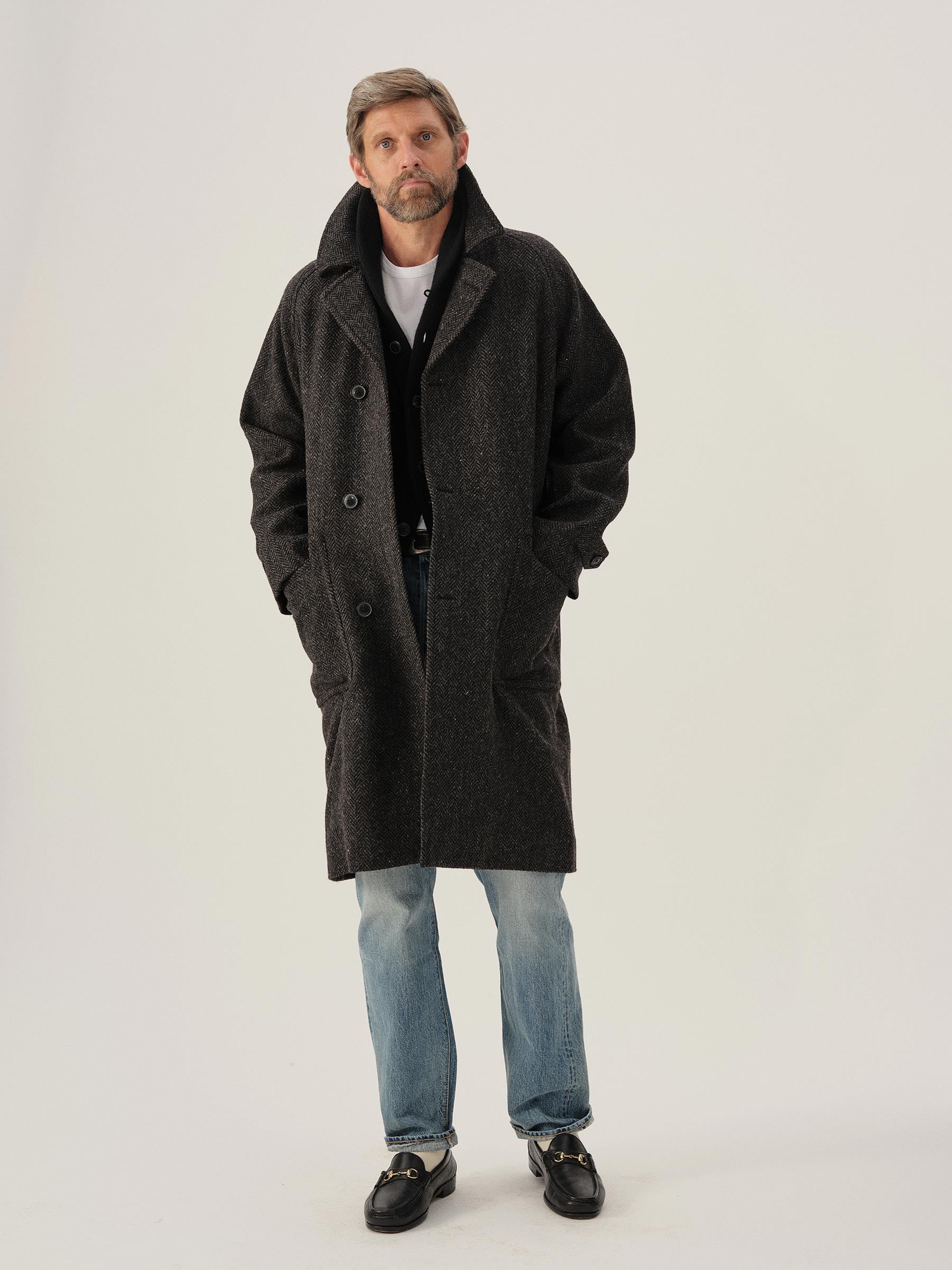 Raglan-sleeved overcoat inspired by WW2 military trench coats with full canvas construction in a classic fit designed for layering and engineered to fit a wide range of body types. This rich textured handwoven Donegal tweed is hearty and resilient, providing substantial warmth while remaining breathable and moisture-wicking. Details include full bemberg lining and genuine horn buttons, two patch-and-flap pockets at hip, two interior welt pockets, a button front closure, a button-through center back vent and buttoned sleeve tabs.