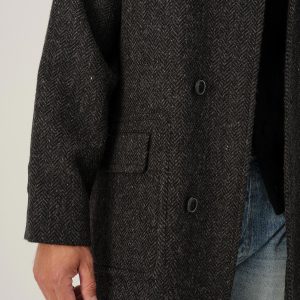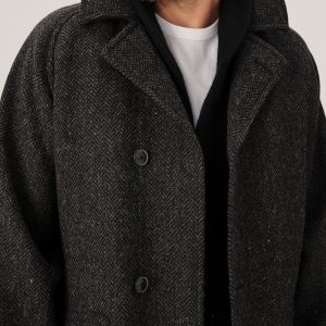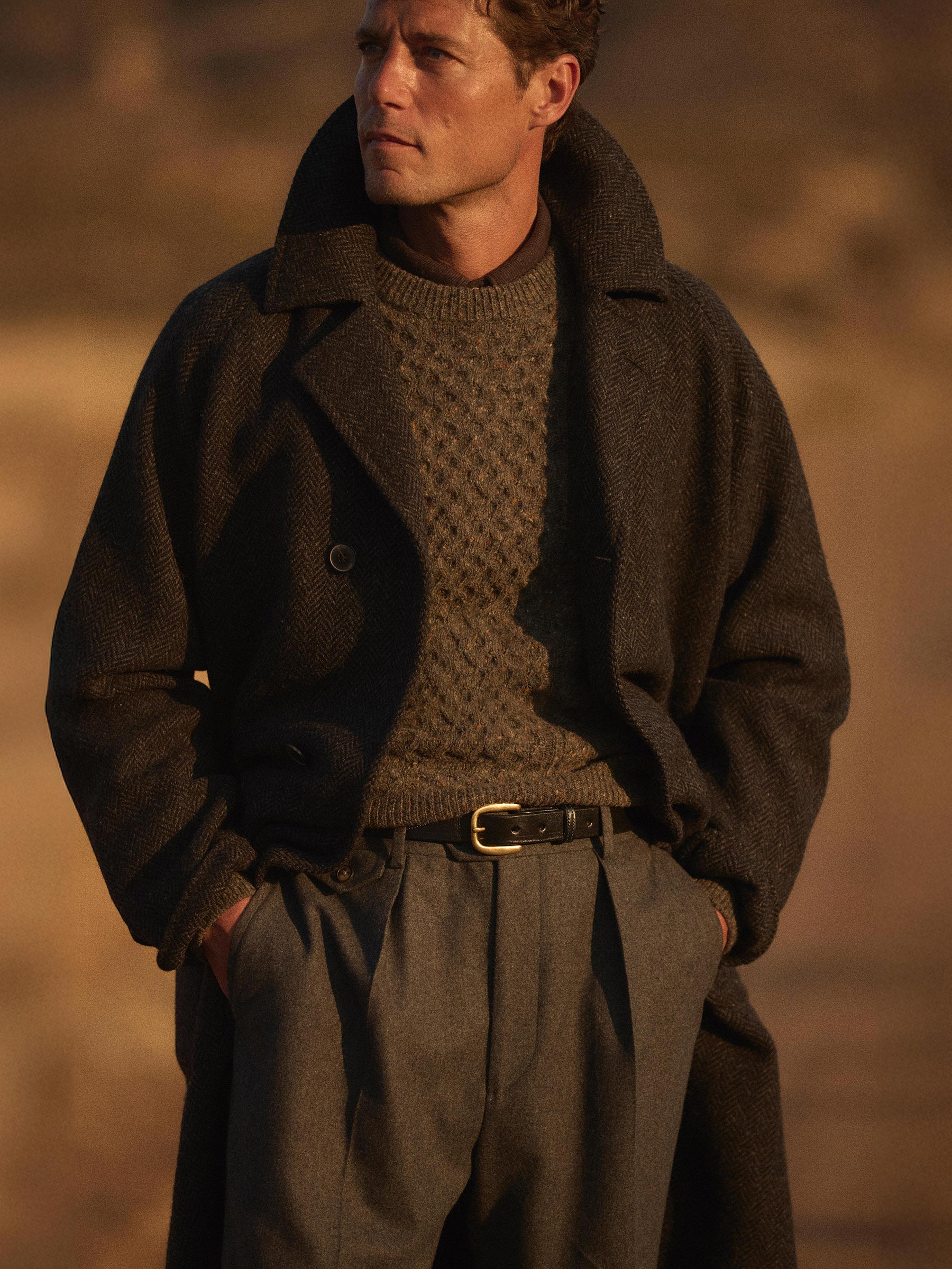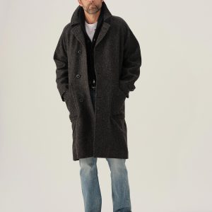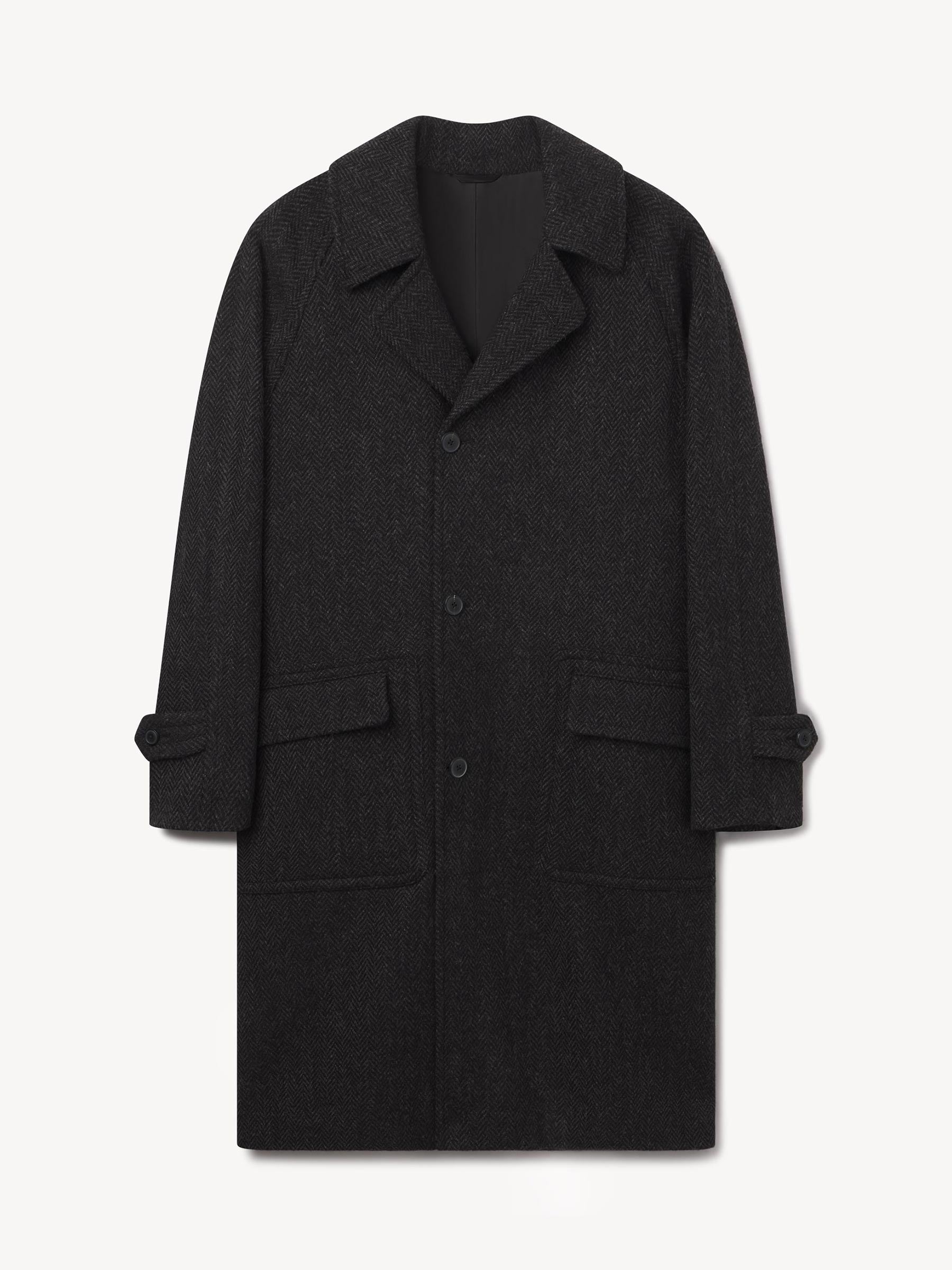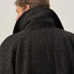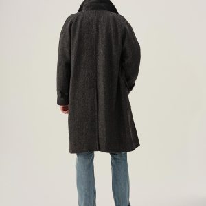 Raglan-sleeved overcoat inspired by WW2 military trench coats with full canvas construction in a classic fit designed for layering and engineered to fit a wide range of body types. This rich textured handwoven Donegal tweed is hearty and resilient, providing substantial warmth while remaining breathable and moisture-wicking. Details include full bemberg lining and genuine horn buttons, two patch-and-flap pockets at hip, two interior welt pockets, a button front closure, a button-through center back vent and buttoned sleeve tabs.