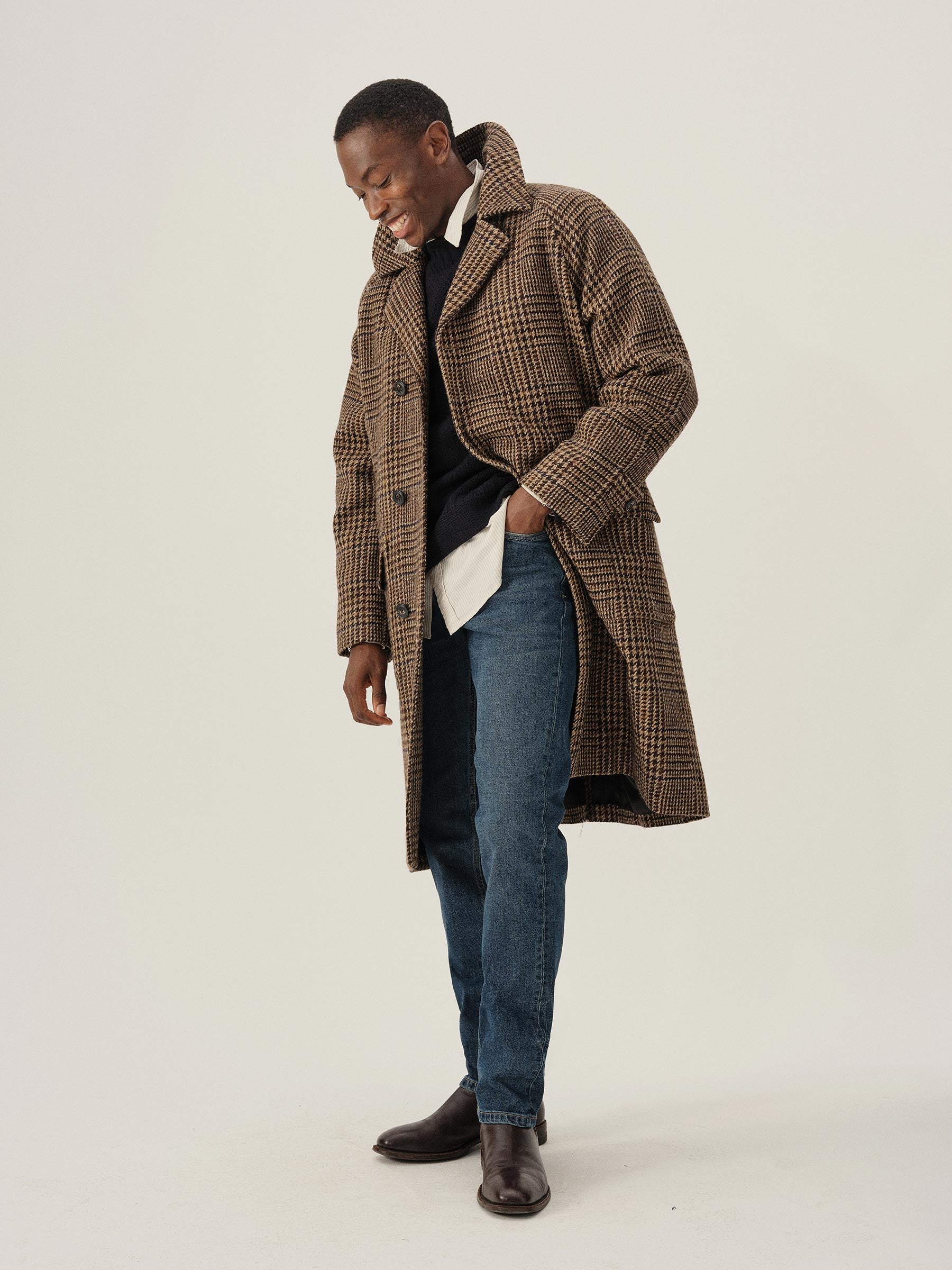 Raglan-sleeved overcoat inspired by WW2 military trench coats with full canvas construction in a classic fit designed for layering and engineered to fit a wide range of body types. This rich textured handwoven Donegal tweed is hearty and resilient, providing substantial warmth while remaining breathable and moisture-wicking. Details include full bemberg lining and genuine horn buttons, two patch-and-flap pockets at hip, two interior welt pockets, a button front closure, a button-through center back vent and buttoned sleeve tabs.