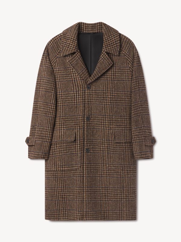 Raglan-sleeved overcoat inspired by WW2 military trench coats with full canvas construction in a classic fit designed for layering and engineered to fit a wide range of body types. This rich textured handwoven Donegal tweed is hearty and resilient, providing substantial warmth while remaining breathable and moisture-wicking. Details include full bemberg lining and genuine horn buttons, two patch-and-flap pockets at hip, two interior welt pockets, a button front closure, a button-through center back vent and buttoned sleeve tabs.