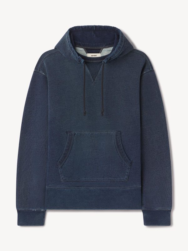 Classic fit 1940s style pullover hoodie cut from dense, indigo yarn-dyed 540 GSM cotton French terry. Softly structured and warm, the indigo will fade and pick up a ton of character with wear. Garment washed for a lived-in feel.