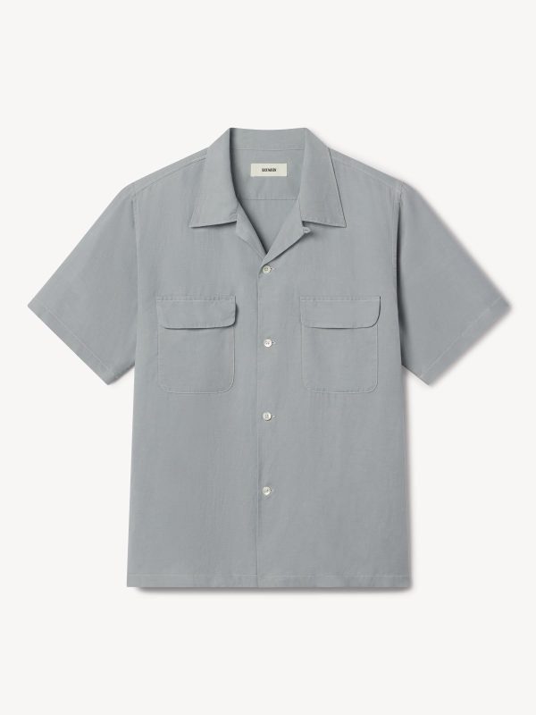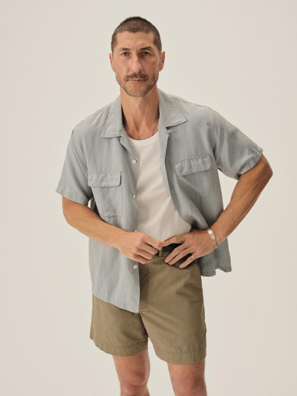 Classic fit short sleeve camp shirt cut from a 5.25 oz. yarn-dyed linen blend with a subtle luster and relaxed drape. Features a six-button placket with mother of pearl buttons, twin patch-and-flap chest pockets, straight hem, and a loop and button closure at the neck. Constructed with clean finished seams. Garment washed with enzymes for a lived-in feel.