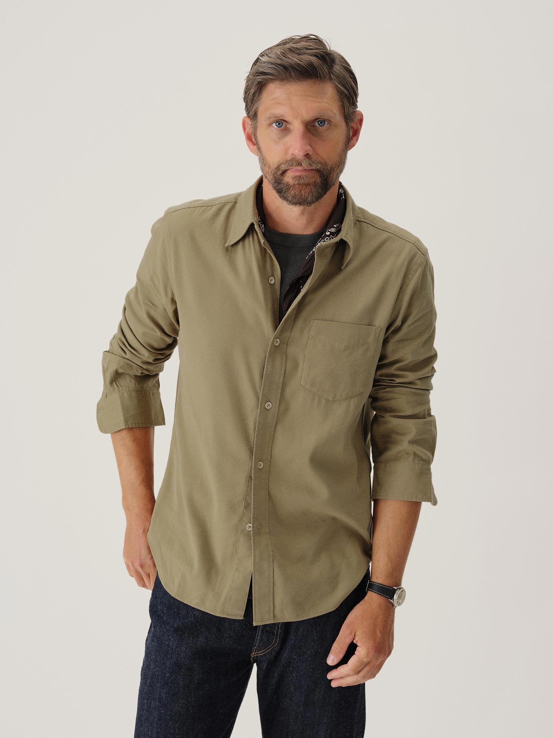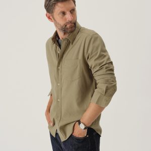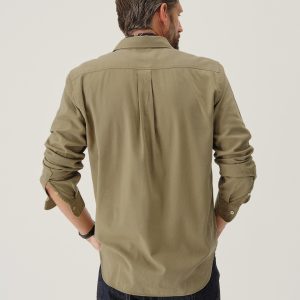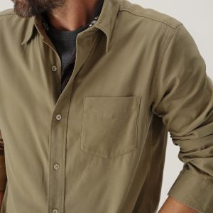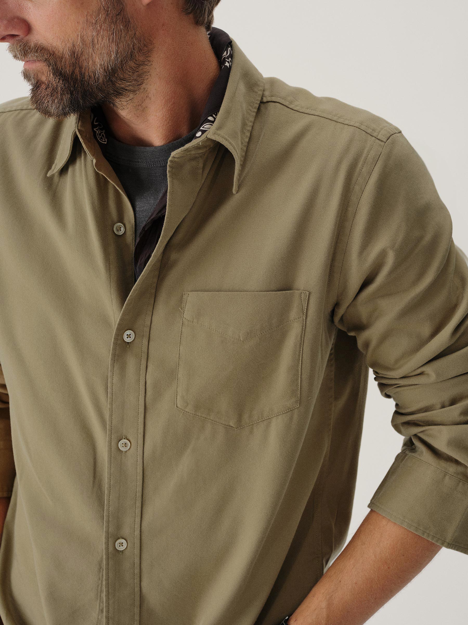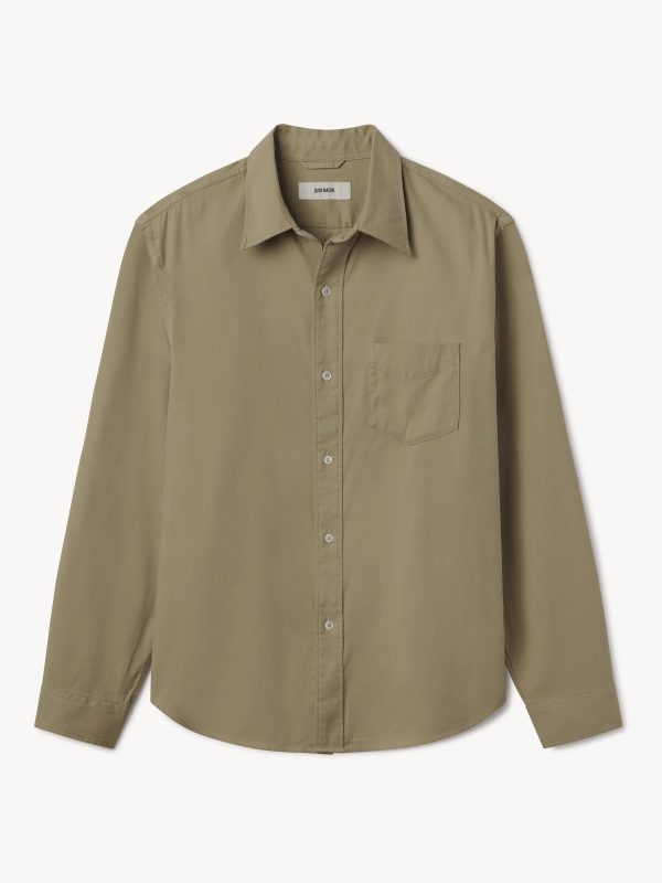 Slim fit long sleeve button up shirt in 5.25 oz. cotton/rayon twill with a subtle luster and an easy drape. Details include mother of pearl buttons, a single spade pocket at the chest, and a box pleat at the back yoke. Constructed with single needle topstitch detailing with double needle stitching at the collar and cuffs. Garment washed with softener for a lived-in feel.