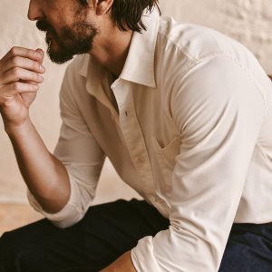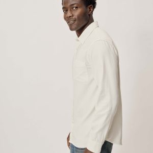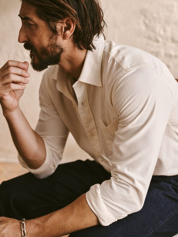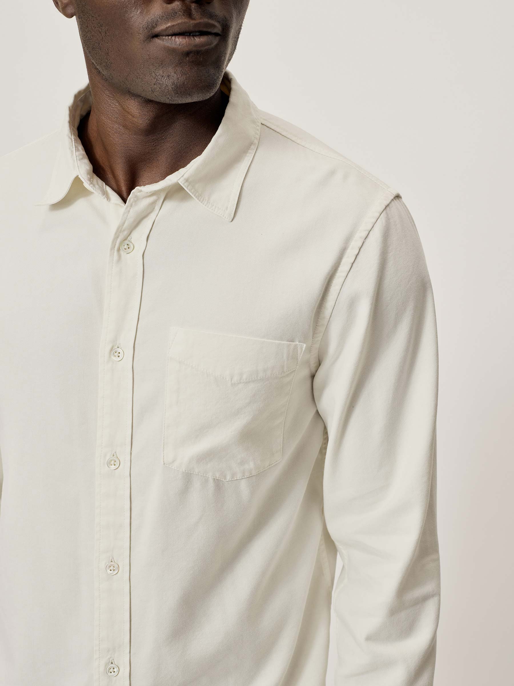 Slim fit long sleeve button up shirt in 5.25 oz. cotton/rayon twill with a subtle luster and an easy drape. Details include mother of pearl buttons, a single spade pocket at the chest, and a box pleat at the back yoke. Constructed with single needle topstitch detailing with double needle stitching at the collar and cuffs. Garment washed with softener for a lived-in feel.