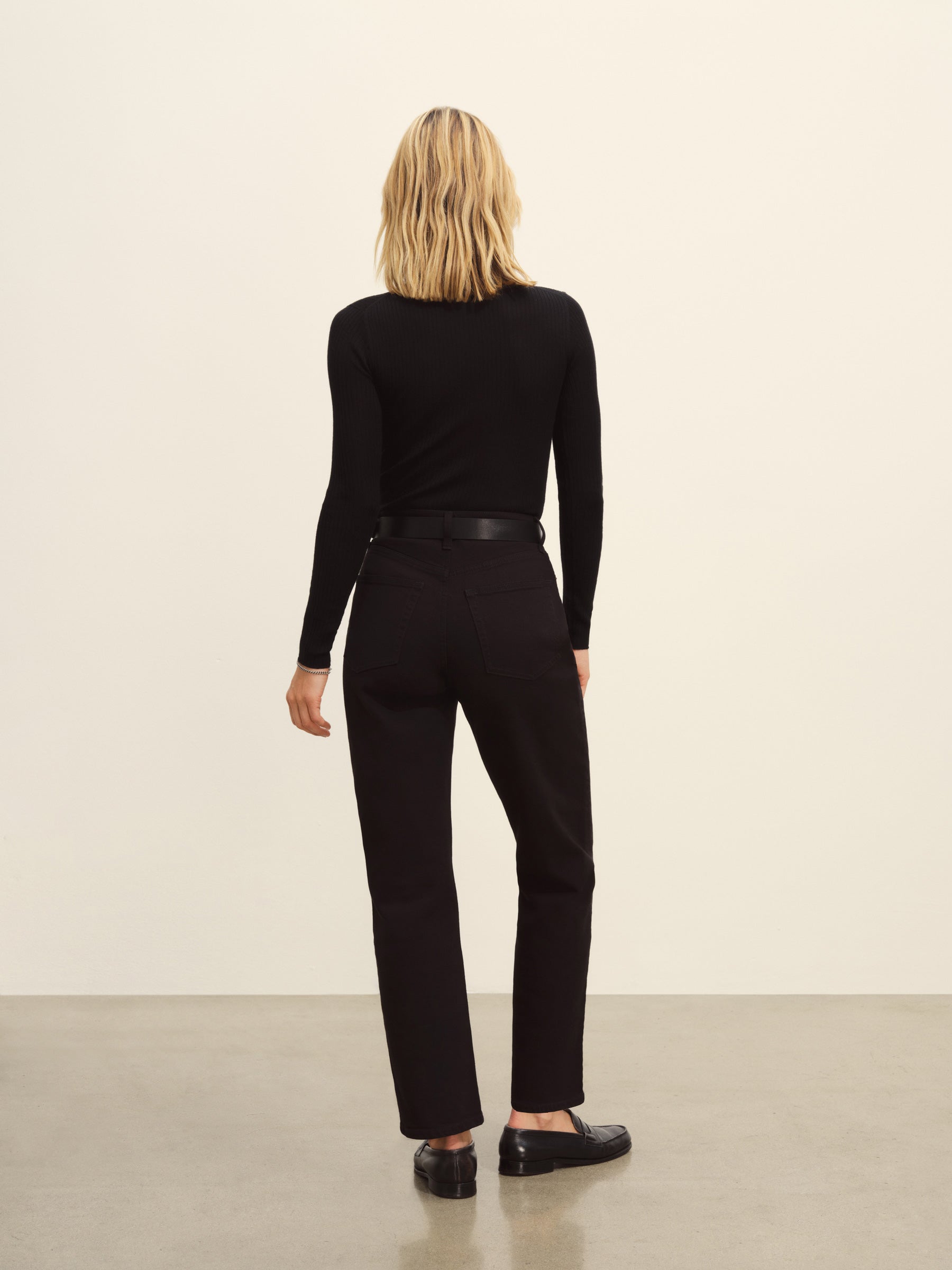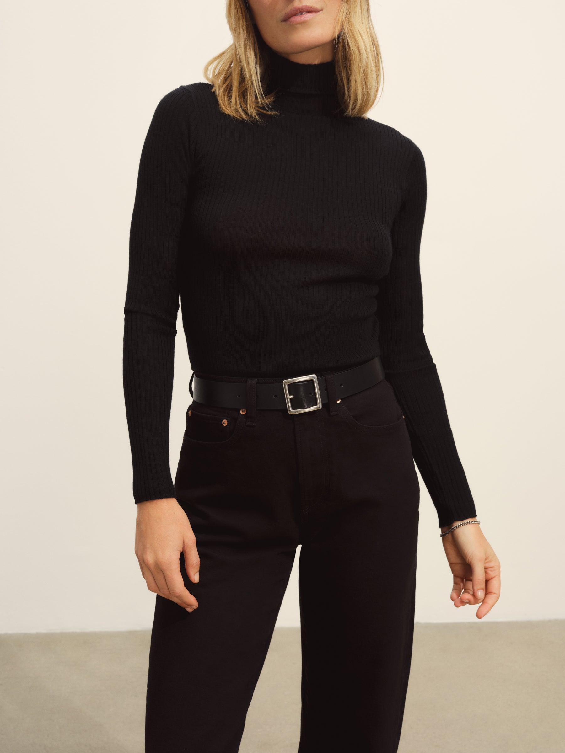 Slim fit turtleneck sweater in a 24″” length, elevated in a 14 gauge variegated rib knit from a blend of merino wool, silk, and cashmere. Luxe, easy, and ideal for layering. Constructed with self-starting hem and sleeve trim and fashioning at the neckline and back shoulder for durability.