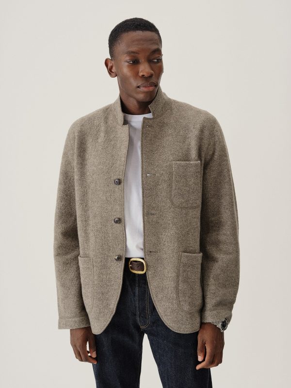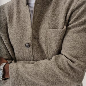 Classic fit chore coat with a slimmer cut through the arms and room in the torso for layering. This 340 GSM felted merino wool has been twice boiled for improved insulation and durability. Details include three patch pockets, real horn buttons, and a notch collar. Constructed with hand-sewn facings and cover-stitching throughout.