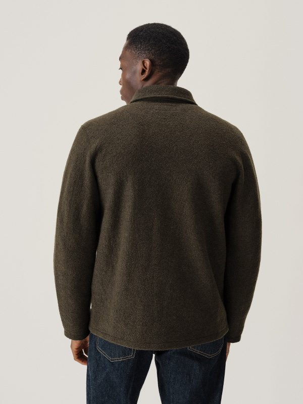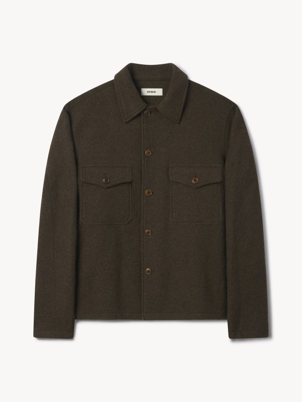 Classic fit field shirt in 340 GSM felted merino wool, twice boiled for improved insulation and durability. Details include patch-and-flap chest pockets and a button front closure. Constructed with hand-sewn facings and cover-stitching with flat seams for comfort.