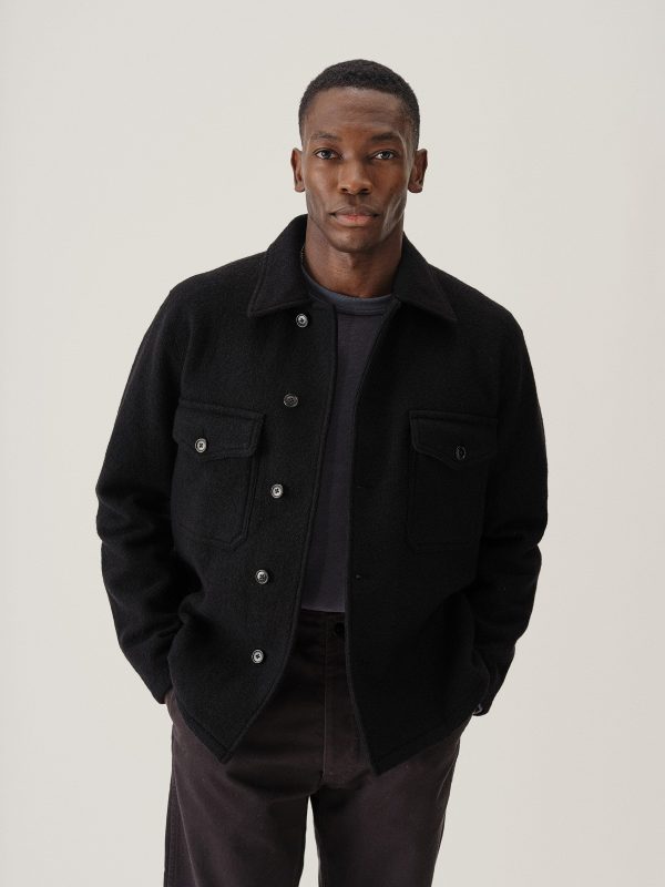 Classic fit field shirt in 340 GSM felted merino wool, twice boiled for improved insulation and durability. Details include patch-and-flap chest pockets and a button front closure. Constructed with hand-sewn facings and cover-stitching with flat seams for comfort.