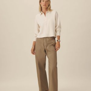 Inspired by the men’s Field-Spec Rugby, the women’s version is cut from 100% cotton in a dense slub jersey with a structured hand. Cut with a cropped, boxy fit and long sleeves, it’s designed with a woven twill collar and placket, tonal poly buttons at the center front, and herringbone-trimmed side slits.