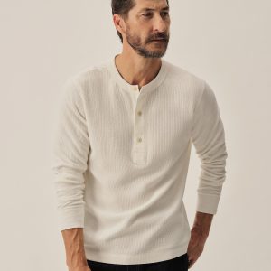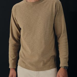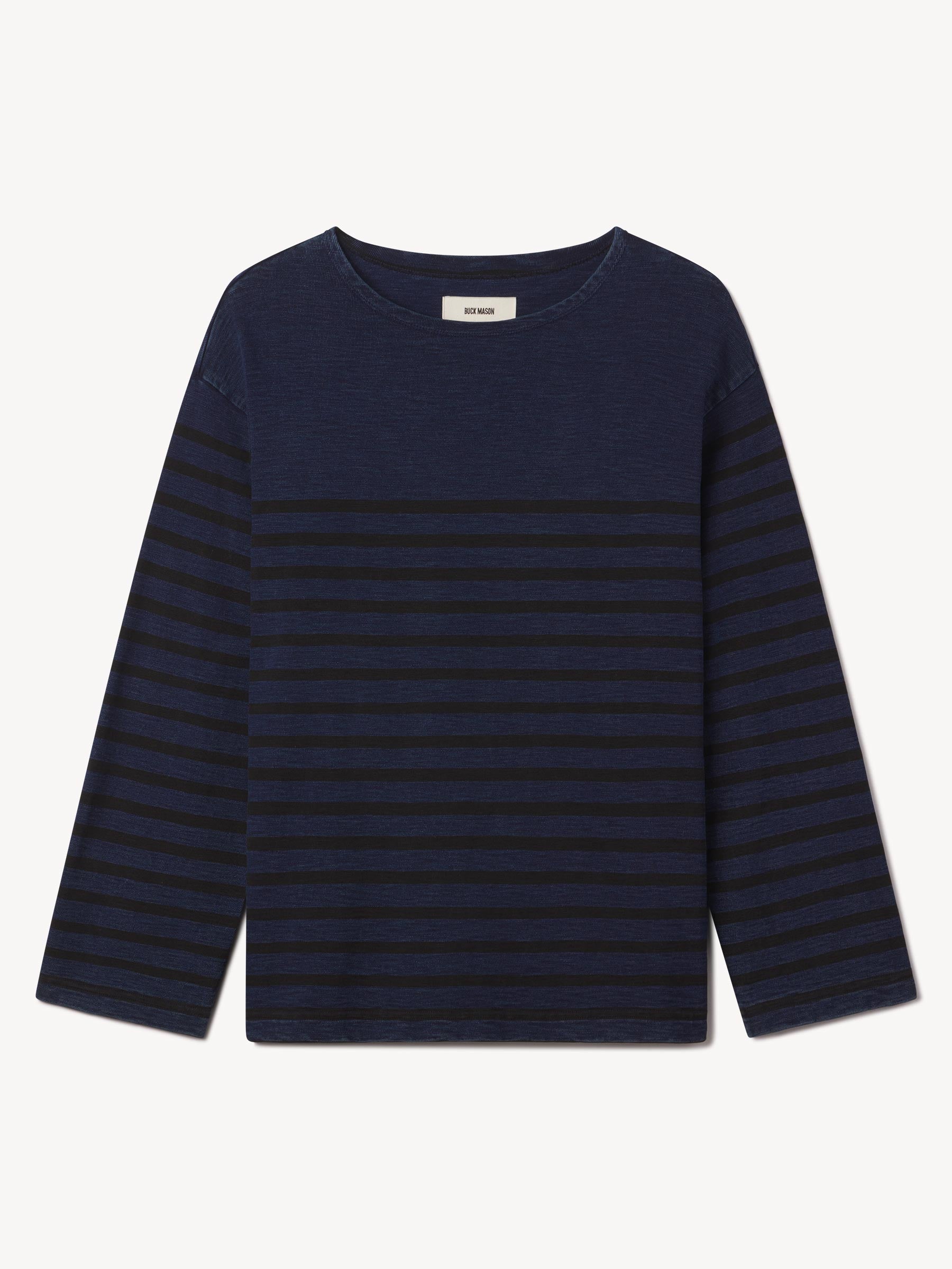 Nautical-inspired boxy fit short sleeve wide neck tee with a straight hem, longer sleeve length, drop shoulder, high neck, and wide ribbed collar. The soft cotton jersey, yarn-dyed in indigo and black sulfur stripe pattern, is about twice as heavy as our Pima tees, with tiny vertical ribs that gently glide across the skin. This is a solid, substantial stand-alone tee for cold weather that will pick up a ton of character over time.