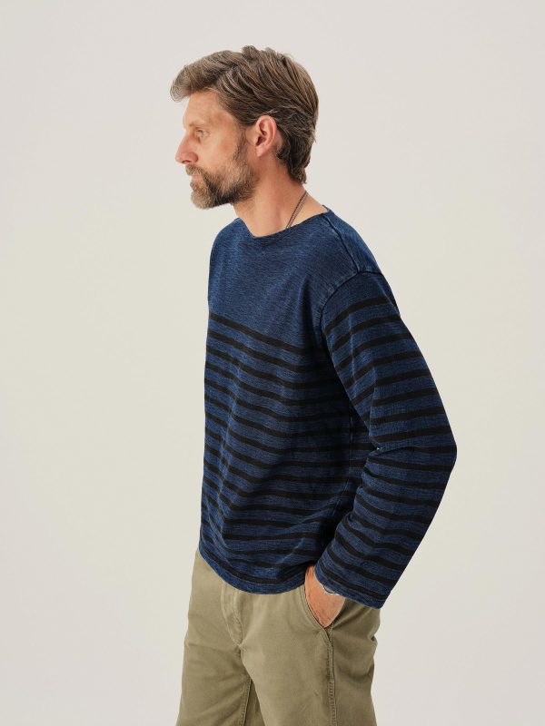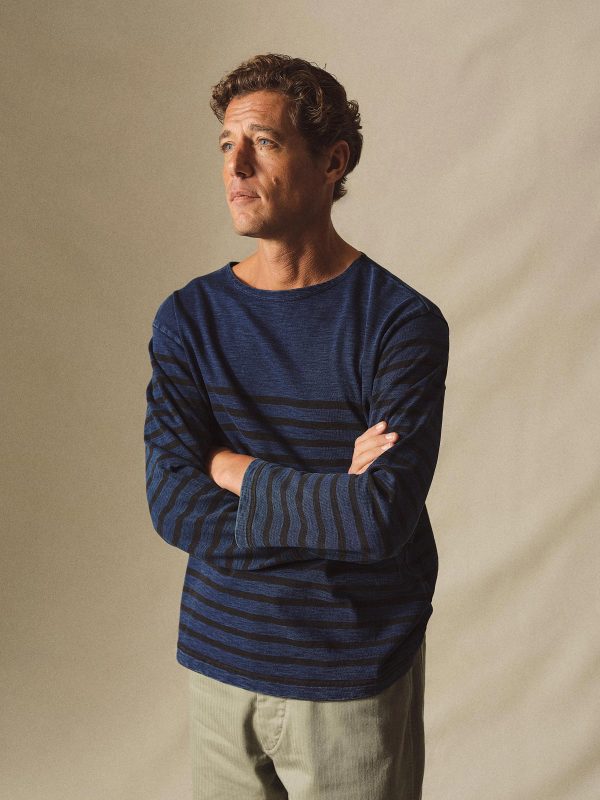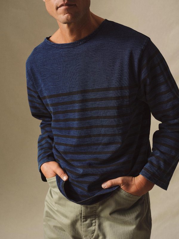 Nautical-inspired boxy fit short sleeve wide neck tee with a straight hem, longer sleeve length, drop shoulder, high neck, and wide ribbed collar. The soft cotton jersey, yarn-dyed in indigo and black sulfur stripe pattern, is about twice as heavy as our Pima tees, with tiny vertical ribs that gently glide across the skin. This is a solid, substantial stand-alone tee for cold weather that will pick up a ton of character over time.