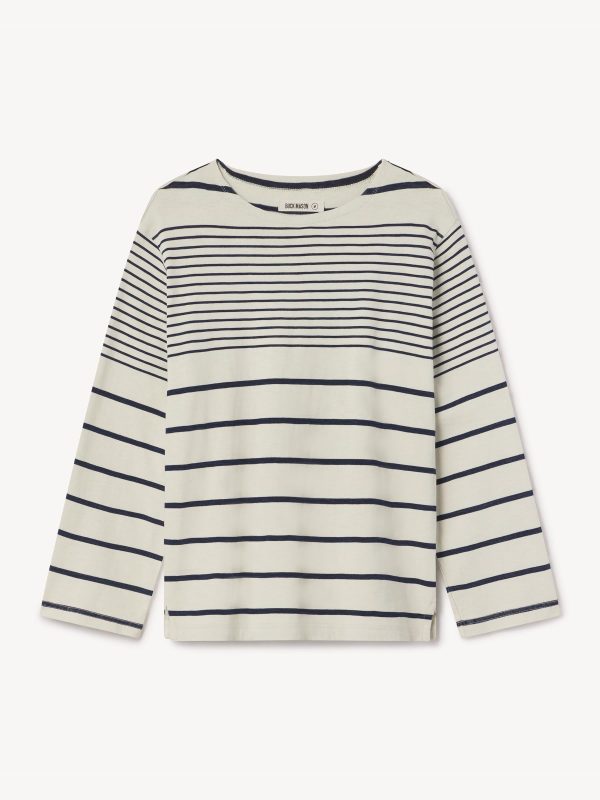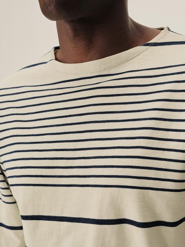 Nautical-inspired boxy fit short sleeve wide neck tee with a straight hem, longer sleeve length, drop shoulder, high neck, and wide ribbed collar. The soft cotton jersey, yarn-dyed in indigo and black sulfur stripe pattern, is about twice as heavy as our Pima tees, with tiny vertical ribs that gently glide across the skin. This is a solid, substantial stand-alone tee for cold weather that will pick up a ton of character over time.