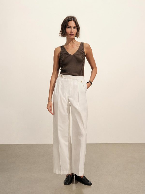 Slim-fit, vintage-inspired V-neck tank crafted from 100% Italian cotton yarn with a 3×3 deep rib structure. Designed with concealed chain threads and snaps beneath each shoulder to keep bra straps in place. Garment washed for a truly vintage, broken-in feel.