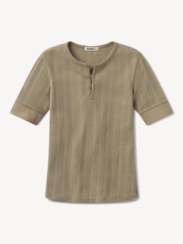 Military-inspired short sleeve henley, crafted from a superfine blend of new and recycled cotton with a subtle, textured rib. Featuring a three-button loop placket and sleeve cuffs. Finished with mother of pearl buttons and garment washed for a lived-in feel.