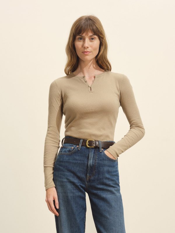 “Slim fit long sleeve henley cut from extra fine 170 GSM cotton with recycled content that holds its shape. Details include a a three-button loop placket with corozo fish eye buttons, and straight, clean finished hem and cuffs. Garment washed for a lived-in feel.