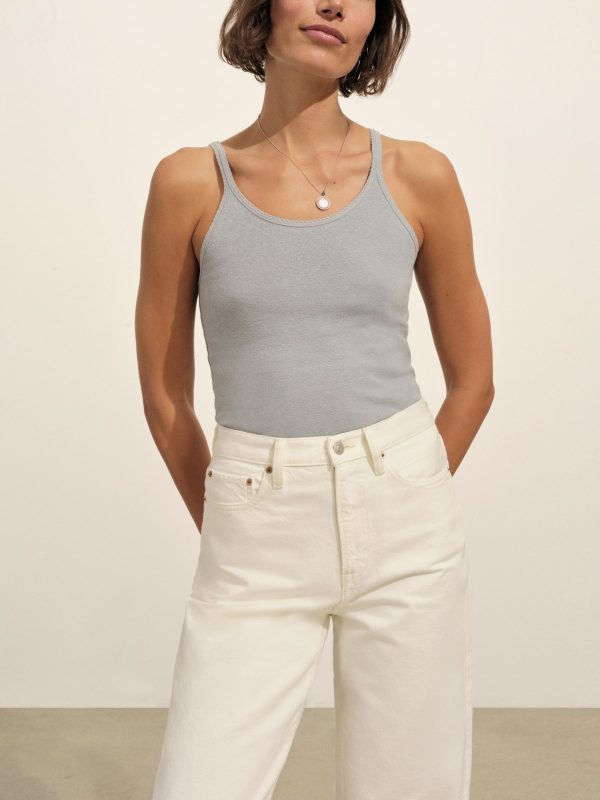 Slim-fit, vintage-inspired scoop tank made from a blend of 60% recycled cotton and 40% cotton. Featuring a combo of jersey fabric and scallop stitch details at the armholes and neckline, it also includes baby snaps for the bra holder.