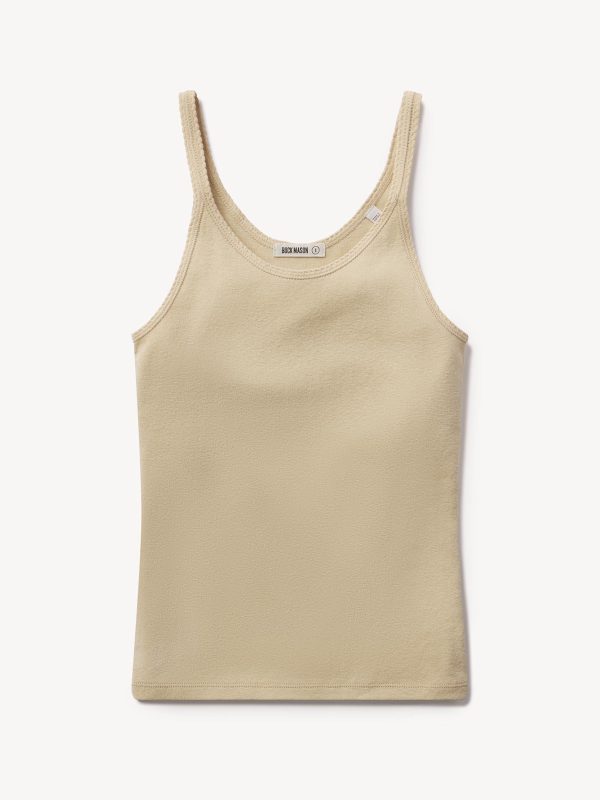 Slim-fit, vintage-inspired scoop tank made from a blend of 60% recycled cotton and 40% cotton. Featuring a combo of jersey fabric and scallop stitch details at the armholes and neckline, it also includes baby snaps for the bra holder.