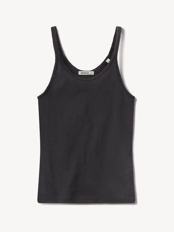 Slim-fit, vintage-inspired scoop tank made from a blend of 60% recycled cotton and 40% cotton. Featuring a combo of jersey fabric and scallop stitch details at the armholes and neckline, it also includes baby snaps for the bra holder.