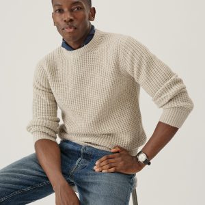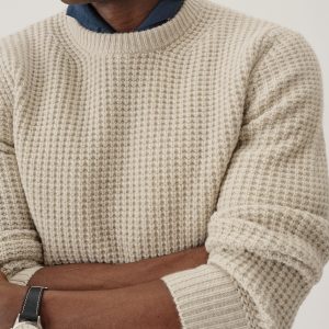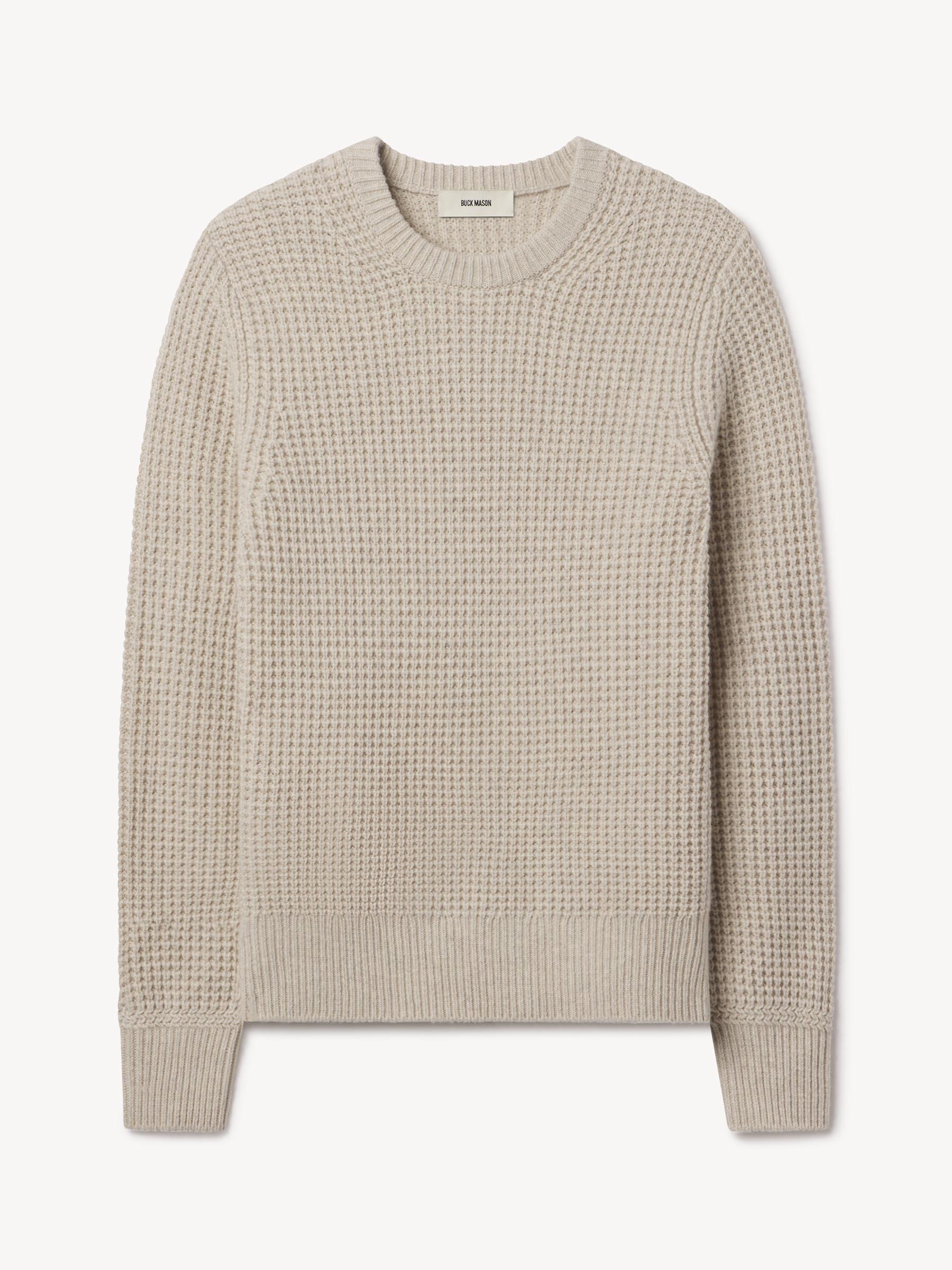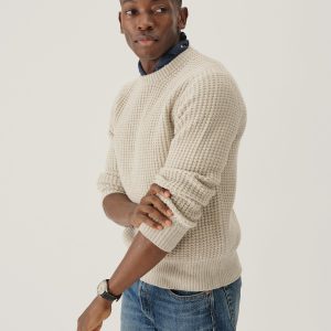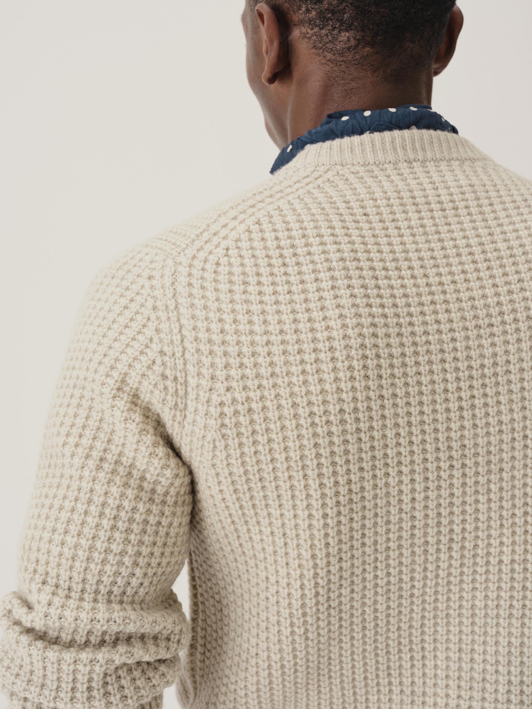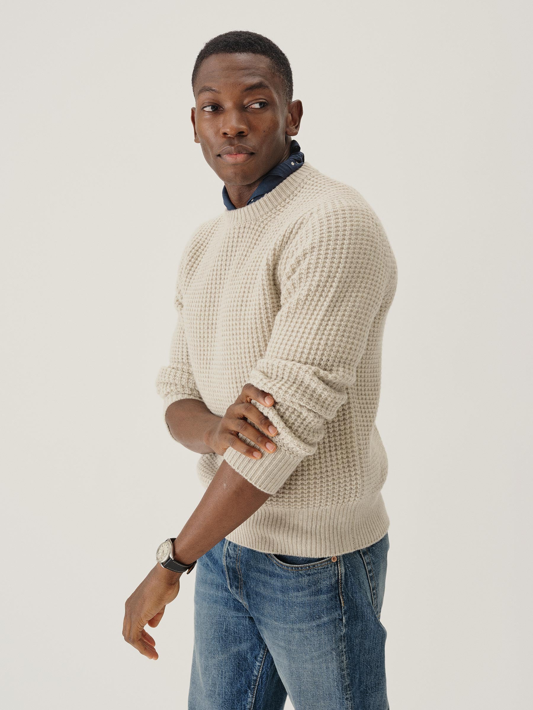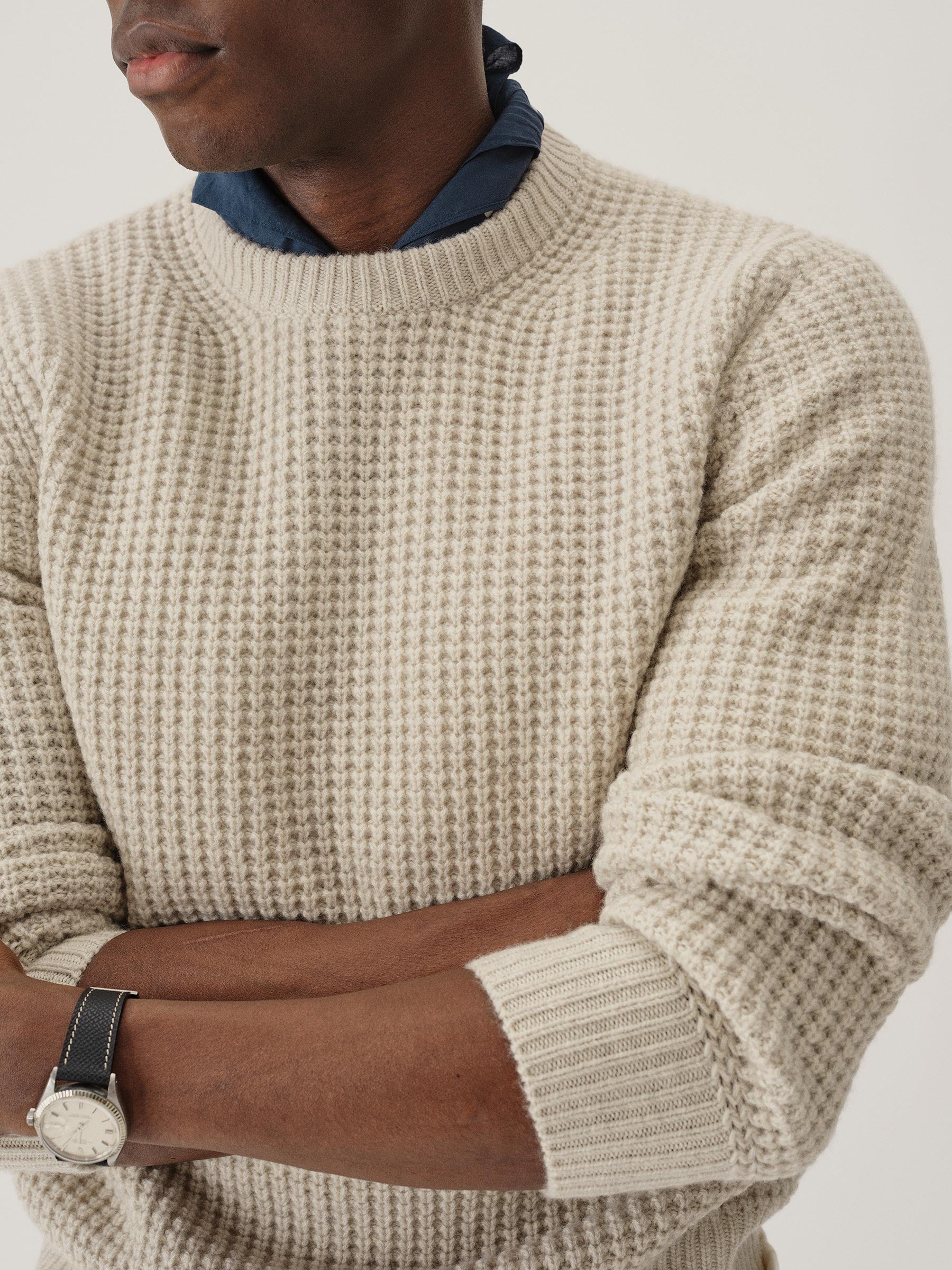 Classic crewneck waffle-knit from 5 gauge wool: a chunky, substantial yarn that’s soft to the touch. 95% Merino wool for warmth and durability, rounded out with 5% cashmere for added smoothness. The result: all the warmth, zero itch. Saddle shoulder for a comfortable fit with rib fashioning on the collar, cuffs, and hems.