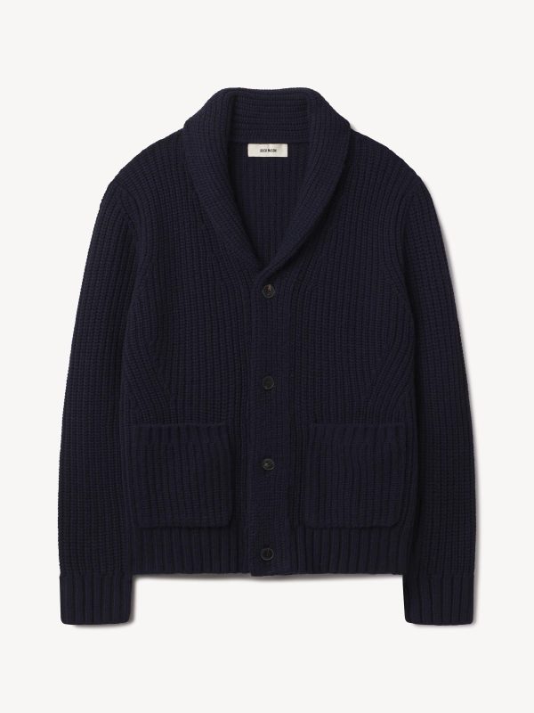 Classic fit shawl cardigan in a three gauge half cardigan rib stitch knit from a yarn-dyed blend of merino wool and cashmere. Details include ribbing at the collar, cuffs, and hem, hip pockets, and branded horn buttons. Constructed with engineered stitch detailing throughout. Garment washed for a lived-in feel.