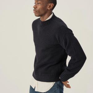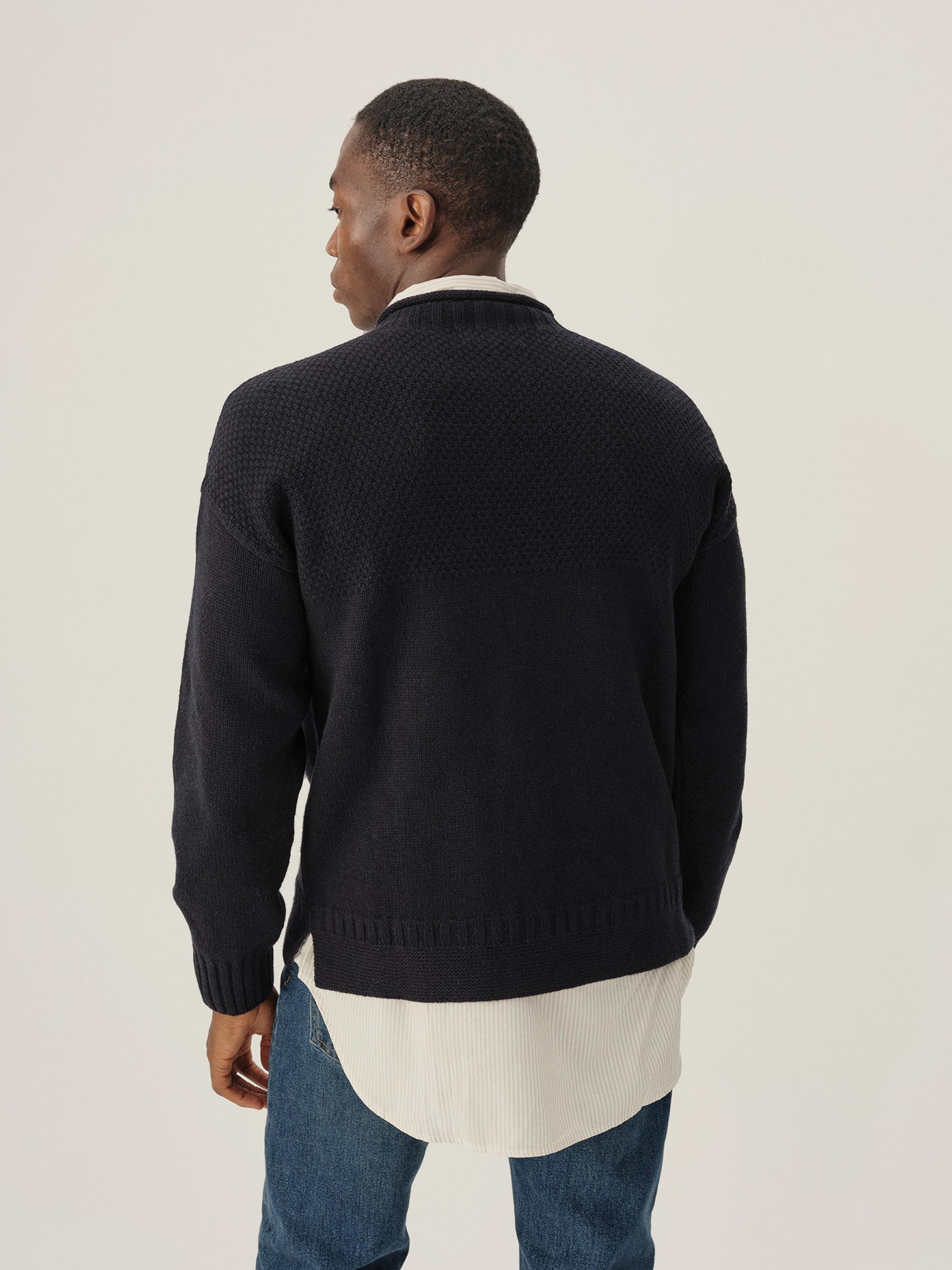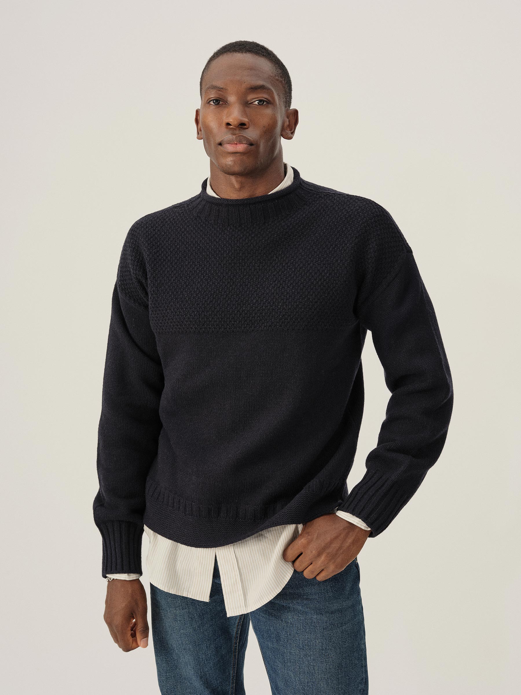 A nod to traditional fishman styles and workwear knits from the 1600s, our Guernsey Rollneck features a relaxed, slightly cropped fit in a comfortable 100% merino wool. Moss stitch upper body with rib finishes at cuffs and collar. Jersey roll at collar top edge with a garter stitch hem.