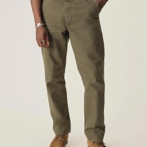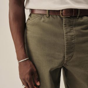 Our Herringbone Twill Field Pant pays tribute to the USMC work trouser turned WWII combat uniform, the P-41. “Repro” style fit with a high rise and full leg, cut from lightweight, 100% cotton HBT. Construction details include felled seams, 2 open back patch pockets, and bar tacks at points of stress. Stonewashed for a broken-in, vintage feel.