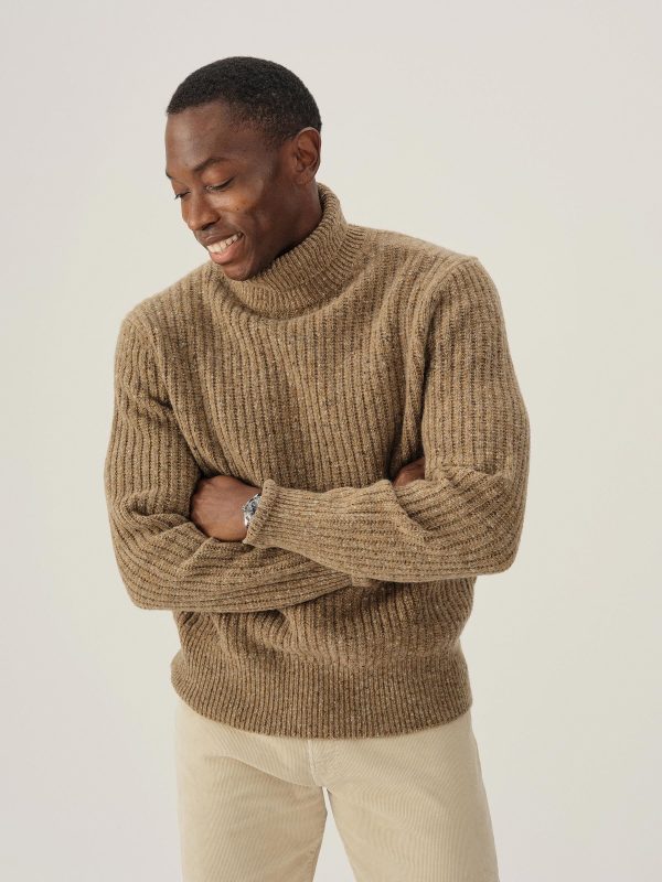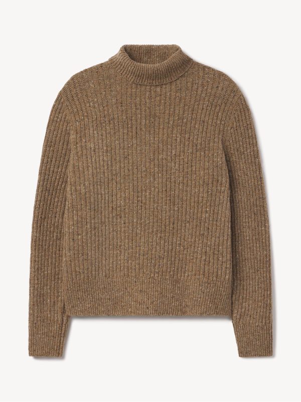Classic fit long sleeve turtleneck sweater in light and breathable 9-gauge Italian yarn-dyed wool blend finely knit in a ribbed pattern with multicolor flecks reminiscent of Donegal tweeds. Constructed with fashioning at the shoulder and armhole and finished with a ribbed collar, cuffs, and hem. Lightly brushed for a softer hand.